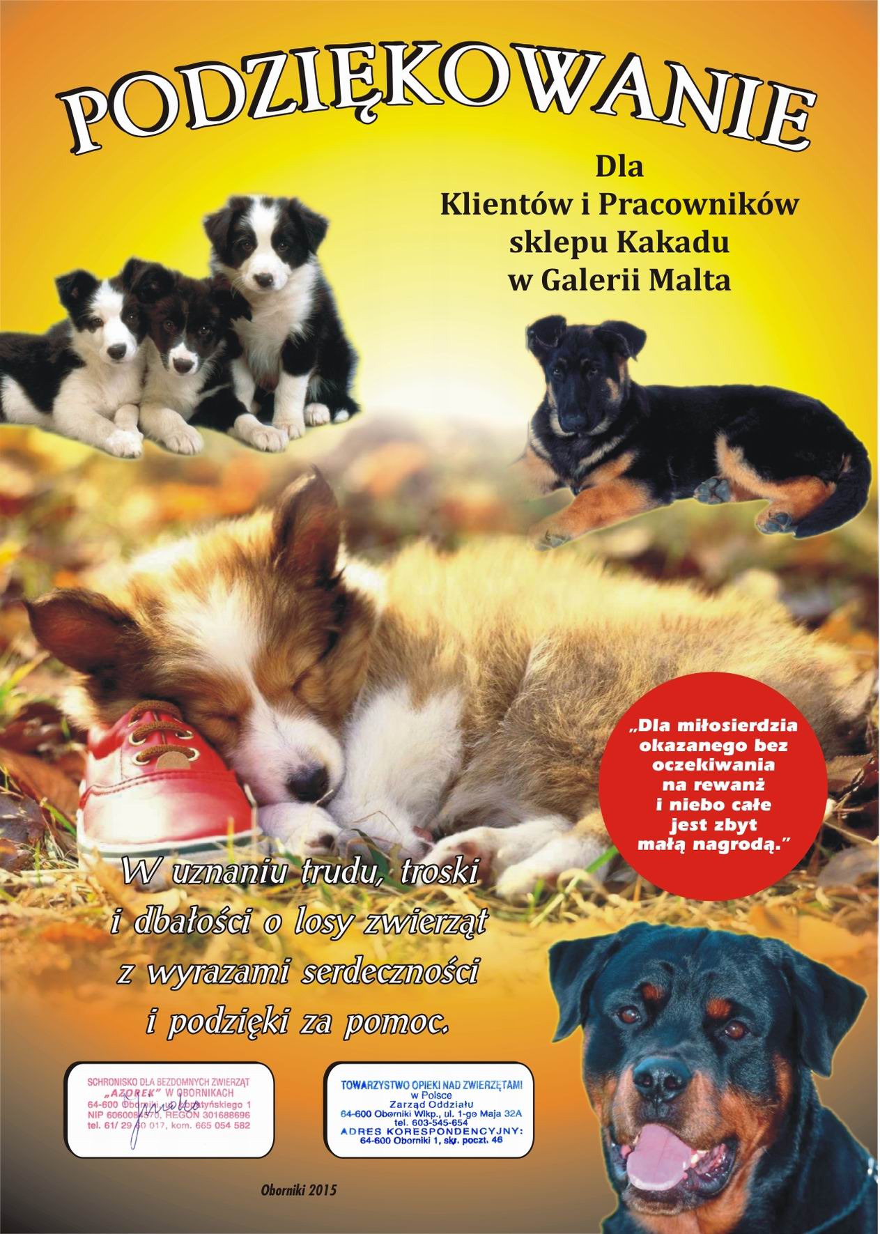 Serdecznie dziękujemy sklepom Kakadu za wieloletnią pomoc w zbieraniu karmy dla "Azorka"...