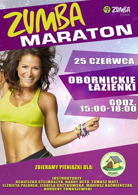 25 czerwca w godz. 15:00-18:00 w Obornickich Łazienkach odbędzie się maraton Zumby Fitness. Rejestracja rozpocznie się o godz. 14:20, a jako tzw "wejściówki" zbierane będzie wszystko co potrzebne schronisku tj. poduszki, koce, jedzenie, zabawki, specjalistyczne karmy.