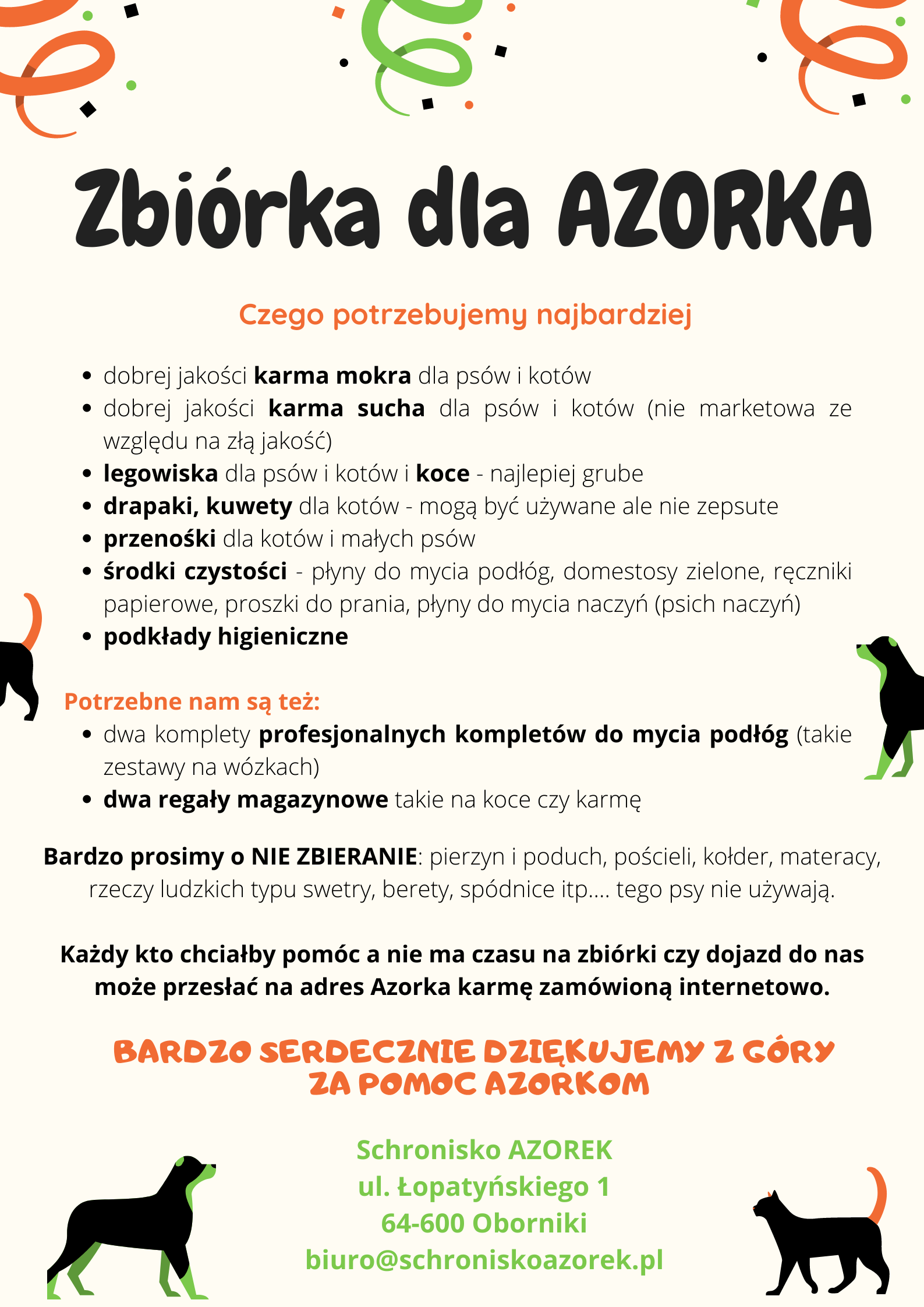 Zbiórka dla Azorka Trwa zbiórka na rzecz naszego schroniska, prosimy o wsparcie. Szczegóły na poniższym plakacie. Tweet Powrót na górę