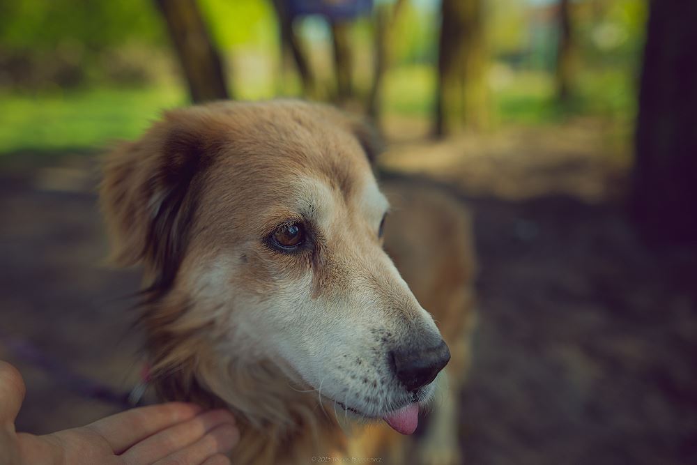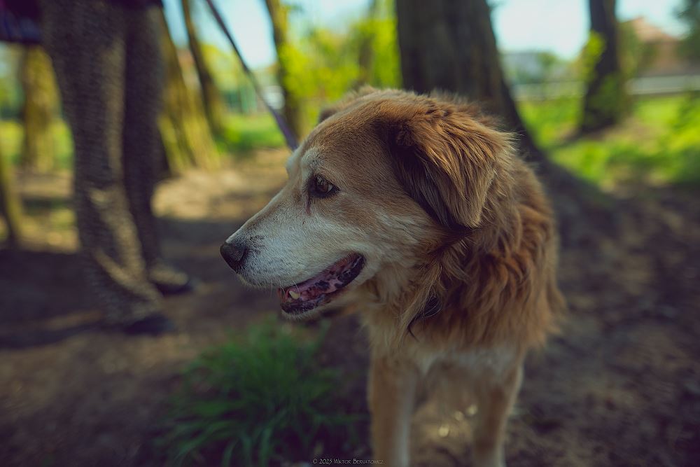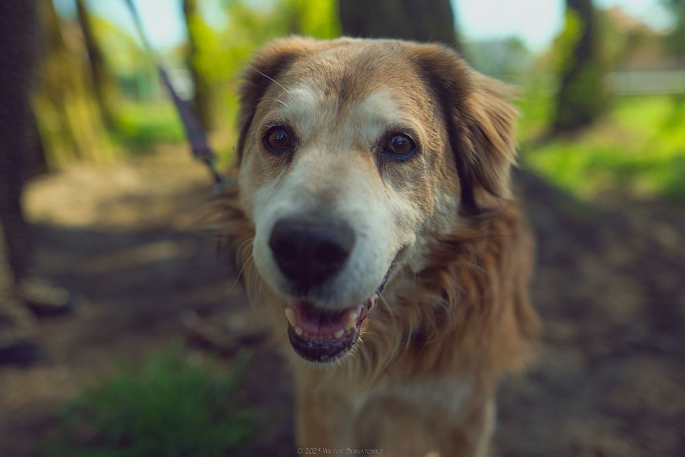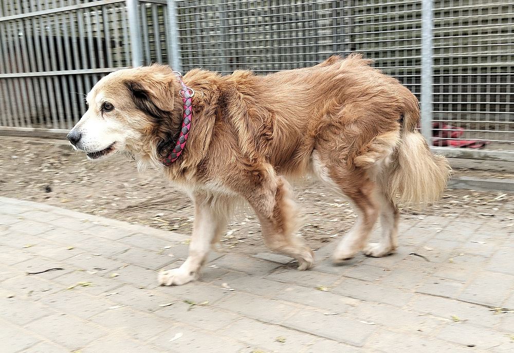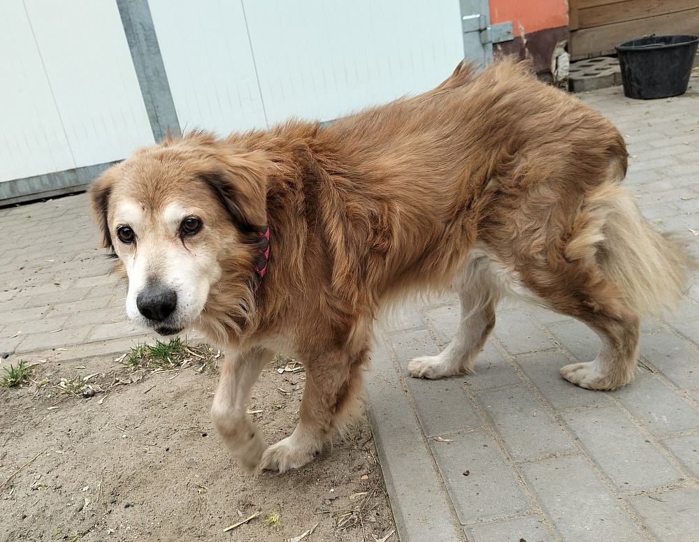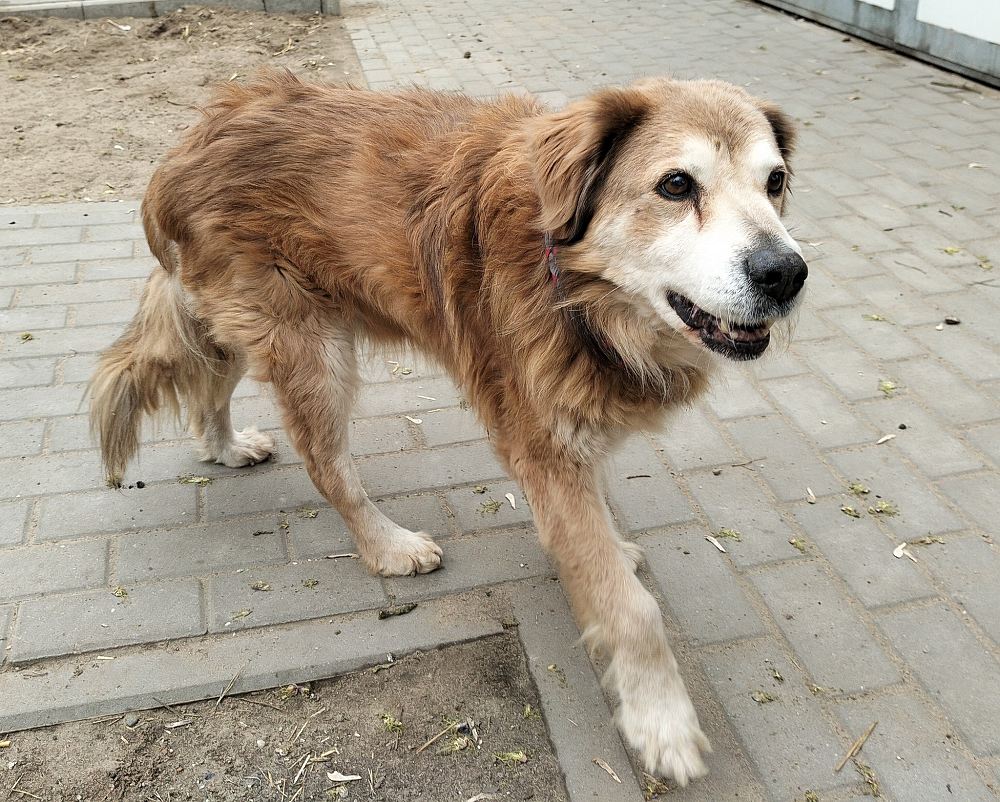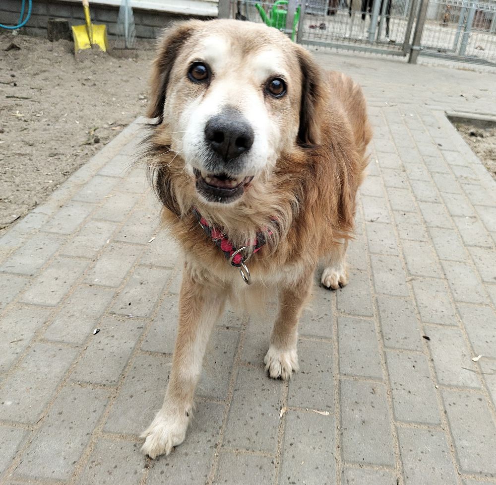 DINGO Starszy pies przywieziony 25 marca 2025 r. z Kościana. Dingo ma ponad 10 lat, waży 18 kg. Staruszek zgadza się z psami. Chętnie chodzi na spacery.