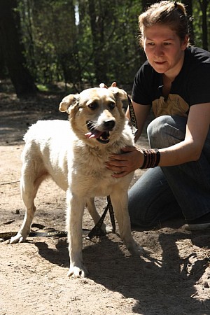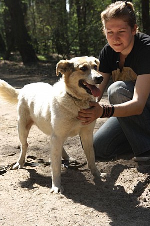 Jest to około 3 letnia suczka. Jest trochę niekonfliktowa.Dusia to żywiołowa suczka. Bardzo lubi się bawić z innymi psami. Kocha dzieci i wychodzić z nimi na spacery. Dusia jest wysterylizowana i czeka na nowy dom.Bardzo wypatruje przyjaznego człowieka - jest gotów oddać serce. Dusia boi się innych psów,dlatego nie wychodzi z budy.