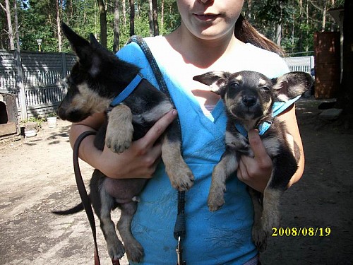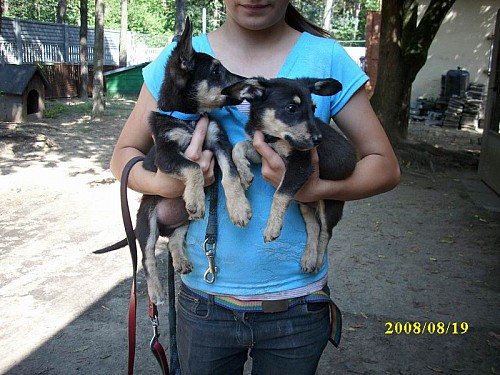 Te maluchy mają około 6 tygodni. Zanim trafiły do schroniska zły i nieodpowiedzialny człowiek przerzucił je przez płot obcego domu.W czasie upadku szczeniaczki doznały kotuzji i miały duży problem z chodzeniem. Obecnie są