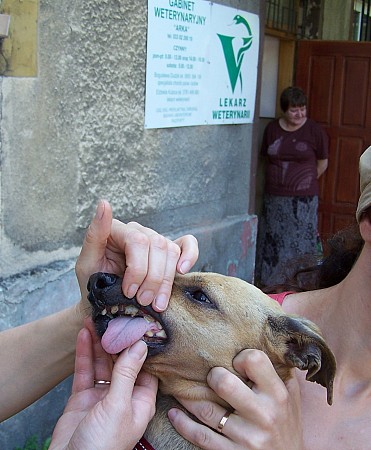 Ząbek to około 12 letni pies a może i starszy.W schronisku od XI 2008.Jest spokojny,niekonfliktowy.Lubi dzieci i spacery z nimi.Imię nadali mu wolontariusze ,dlatego, że ma duże braki w uzębieniu i wypada mu język.Ząbek czeka na nowy domek aby ostatnie lata swego życia spędzić z kochającą rodziną.####2008-12-05: Ząbek.####2008-12-05: Ząbek.####2009-01-16: Nasz milutki Ząbek.####2009-05-03: Ząbek i Edi####2009-06-22: Ząbek z Moniką na wystawie psów nierasowych w Murowanej Goślinie####2009-08-11: Ząbek w drodze do nowego domu####2009-08-11: Ząbek z nową rodziną####2009-08-11: Na lodach####2009-08-11: Pierwszy spacerek####2009-08-11: Wizyta u weterynarza####2009-08-11: z Fredziem####2009-08-11: Z panną Mikusią w nowym domku####2010-12-09: Ząbek