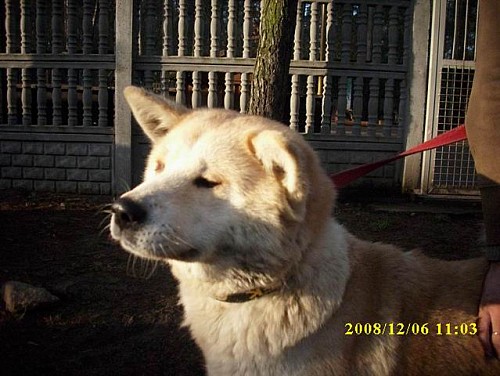 Suczka jest rasy akita-inu.Jest to pies narodowy Japonii.W tym kraju ma swoje pomniki.Suczka ma około 2 lat. Jest spokojna i niekonfliktowa.Po kilku dniach pobytu suczki zaiważono,że ma szwy na brzuchu.Mogł być po cesarskim cięciu lub sterylizacji.Suczka została adoptowana. Nowy właściciel się nią troskliwie zajmie i zrobi jej usg jamy brzusznej i podda operacji powiekę z wrastającymi do oka rzęsami.