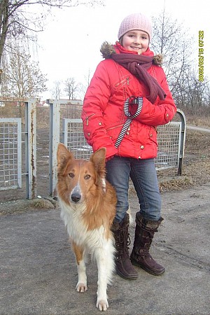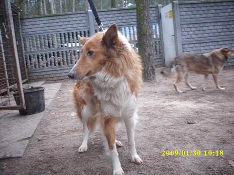 Gabi to suczka owczarka collie.Do schroniska trafiła z cieczką, dlatego jest zamknięta w boksie.sunia została wysterylizowana.Jest grzeczna.Gabi została adoptowana przez rodzinę z Chodzieży z dwiema kilkuletnimi córeczkami.####2009-02-25: Gabi w nowym domu.: Gabi na spacerze z nową przyjaciółką.