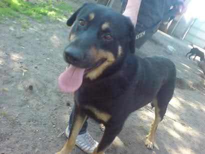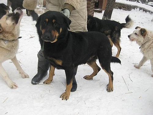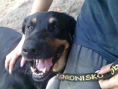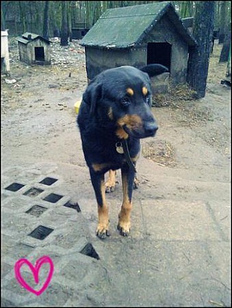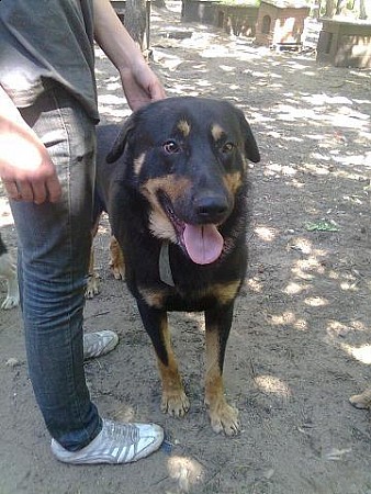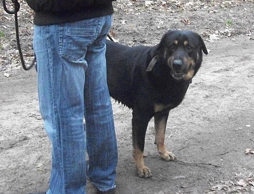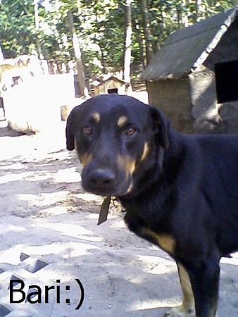 Bari to duży, ok. 8 letni pies, krótkowłosy, czarnopodpalany.
