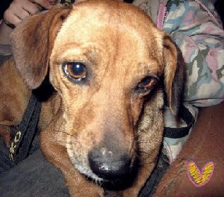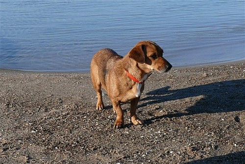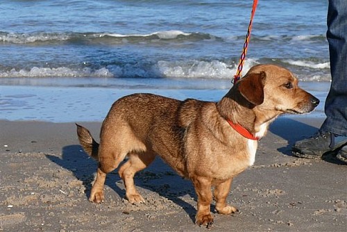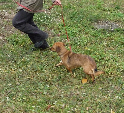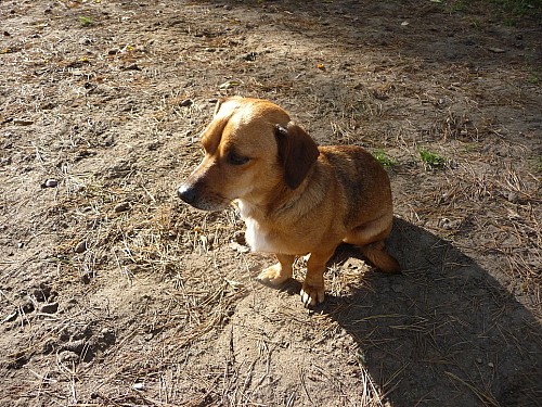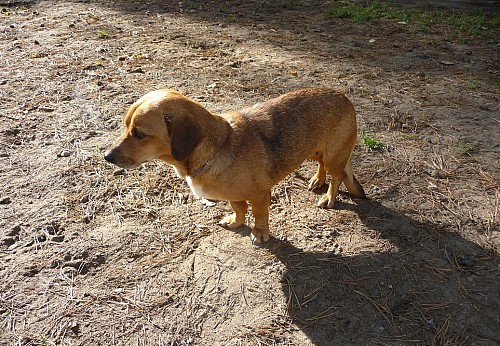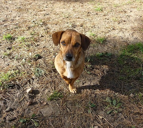 Żabka to około 5 letnia suczka mieszanka jamnika.