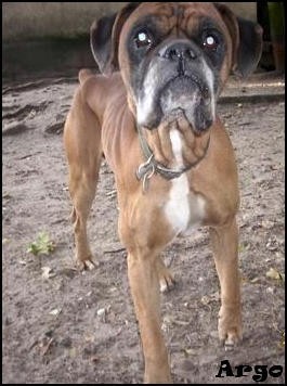 Argo nie mieszka w schronisku.####2009-10-21: Jest to około 6-7 letni pies rasy bokser.Trafił do nas bardzo wychudzony, ale wraca do formy. Dla ludzi miły i przyjazny, ale niestety wobec psów zadziorny. Argo powinien trafić do domu, gdzie nie ma innych psów. Pies czeka na dom.