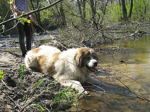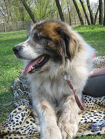 To samiec rasy Bernardyn. Jest w wieku ok. 8 lat.