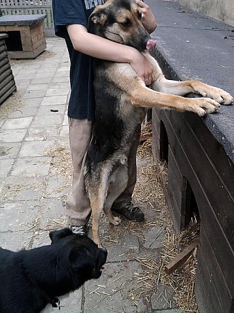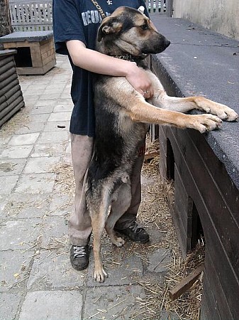 Młody niespełna 2 letni pies. Towarzyski i bardzo przytulaśny. Wesoły, dogaduje się z psami, lecz nieraz pogoni jakiegoś samca. Pragnie kontaktu z ludźmi. Od ludzi domaga się pieszczot, uwagi, kręci piruety z radości, macha ogonkiem... Jest wysokim psiakiem. Ma czarny nosek z różowym paskiem po środku, co mu dodaje uroku. Energiczny i aktywny samiec. Uwielbia zabawy.