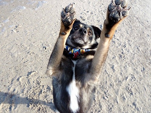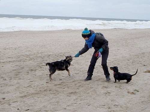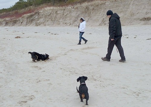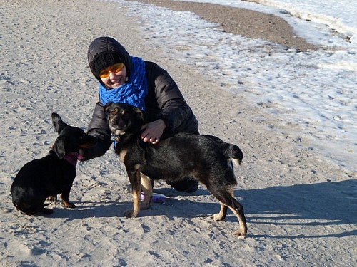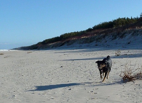 Witam! Przesyłam parę fotek Ziutki z wybrzeża Bałtyku:-) W nadmorskiej miejscowości Międzywodzie mamy mieszkanko w którym spędzamy każdą wolną chwilę, tak więc Ziutka poznała swój drugi dom...i chyba bardzo jej się spodobał:-) Plaża i pobliskie lasy są dla niej rajem - dziewczyna szaleje z szerokim uśmiechem na pysku. Ma tylko jeden problem...lęk wysokości - muszę więc po schodach na plażę znosić to 18 kilo szczęścia na rękach:-) Ziuta jest naprawdę kochanym psiakiem - nie brudzi już w domu, na spacerach przybiega na każde zawołanie (nie bez znaczenia jest tu moja kieszeń wypchana psimi smakołykami), podróż samochodem spokojnie przesypia. Raz tylko wdała się w bójkę z koleżanką jamniczką - poszło o pluszową zabawkę...Okazało się że Ziuta jest wielką wielbicielką i kolekcjonerką zabawek - oprócz swoich bardzo chętnie przywłaszcza też pluszaki jamnika,-) Póki co wszystkie zabawki zostały schowane i "dziewczyny" bawią się patykami na dworze. Wciąż jeszcze Ziuta jest pod opieką weterynarza. Stan zapalny w jednym uchu się przeciąga i nie jest do końca pewna sprawa cycuszków- opuchlizna prawie zeszła ale wciąż wyczuwa się tam zgrubienia - wet obawia się że to jednak guzy i być może będzie potrzebny zabieg usunięcia. Na razie obserwujemy... Tak więc pozdrawiamy znad morza, Ziuta jeszcze śpi ale na pewno kazałaby przesłać osobne merdnięcia ogonem od niej...