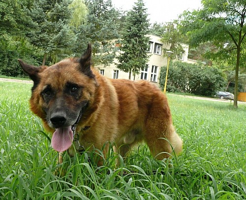 Albert to ponad 10 letni duży pies prawie jak owczarek niemiecki, ma śmiesznie klapnięte jedno uszko. W ogóle nie widać po nim wieku - jest energiczny, bardzo lubi spacery. Albert ma wykrzywioną głowę na jedną stronę co mogło być wynikiem dawnego wylewu lub uderzenia... Na początku był przerażony, zapewne został wyrzucony z powodu swojego wieku... Stał się pewnie bezużyteczną rzeczą, której było trzeba się pozbyć. Albert niekiedy leży i wpatruje się w drzwi od wyjścia jak by miał nadzieję, że jego życie się odmieni. To typ psa, który ma minimalne szanse na adopcję. Duży i starszy- takich psów prawie się nie adoptuje. Ale my wiemy, że cuda się zdarzają i