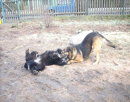 Pieski na nowym wybiegu... Biegają tak szybko, aż się bałam, że nie wyhamują. Bez smyczy, bez tłoku i na cztery ręce do głaskania... Pozdrawiam####2011-09-28: Babajaga z Abisiem na spacerku####2011-09-28: Babajaga lubi pieszczoty i zabawę####2012-02-26: Jantar z Babajagą podczas zabawy####2012-02-26: Babajaga odpoczywa po harcach####2012-02-26: Babajaga w całej krasie####2012-03-03: Babajaga ze swoją Panią i Jantarem####2012-03-03: Babajga z Jantarem w ich kojcu, większość dnia psiaki biegają po ogrodzonym terenie