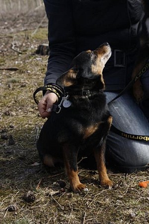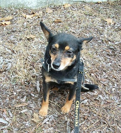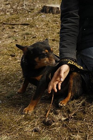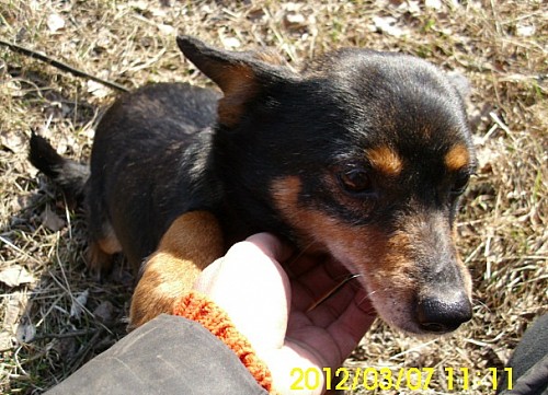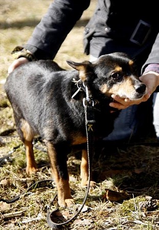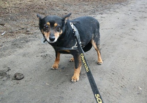 Aza to mała (maksymalnie 5 kg) suczka przywieziona z kilkoma innymi psami z interwencji spod Rogoźna w pierwszych dniach lutego 2012 r. Jest wystraszona i trochę dzika. Potrzebować będzie przebywania z Wolontariuszkami, żeby przekonać się do ludzi. Aza ładnie chodzi na smyczy, jest najśmielsza.