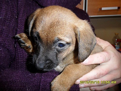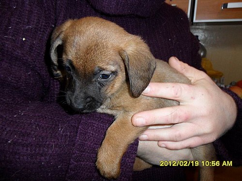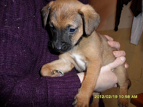Szczeniaki z Suchego Lasu przywiezione 28 lutego 2012 r. razem z siostrą. Samczyk został nazwany Mikusiem, suczka to Pinia.