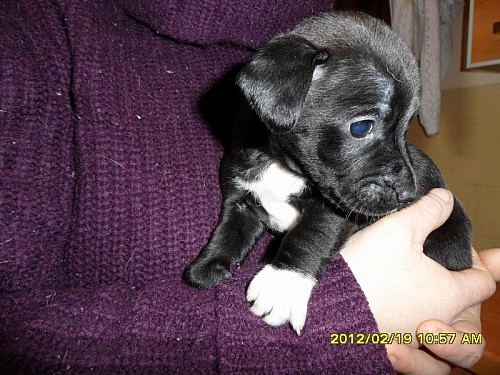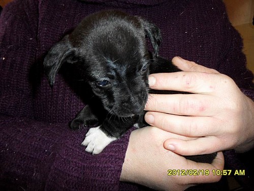 Szczeniak suczka czarna, malutka, przywieziona z Suchego Lasu 28 lutego 2012 roku razem z rodzeństwem. Będzie małym pieskiem.