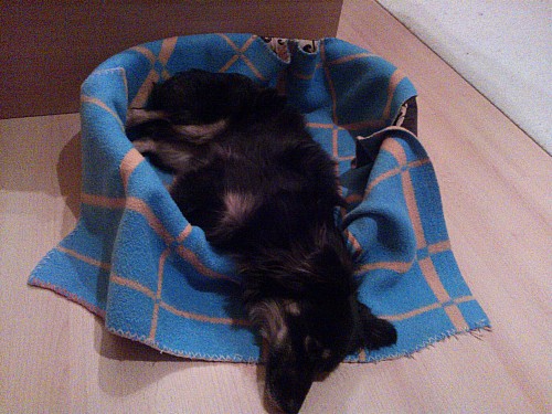 przez okno! :) Wykąpaliśmy ją pierwszego dnia, więc ma teraz śliczną, jedwabistą sierść. Psinka bardzo lubi spacerki, także te długie, ale oczywiście na razie chodzi tylko na smyczy automatycznej, żeby mogła się trochę wybiegać. Jest wielkim pieszczochem, od razu kładzie się na pleckach i chce, żeby głaskać ją po brzuszku. :) Śpi tylko na swoim posłaniu, ale ok. 6 rano budzi się i chce, żeby wyjść z nią na spacerek. Jedynym problemem jest wskakiwanie do łóżka i na kanapę, ale myślę, że uda nam się ją tego oduczyć. Na szczęście załatwia się tylko
