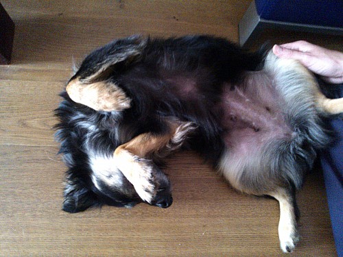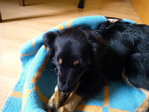 dziennie, którą zjada bardzo szybko i jeszcze wylizuje, a kiedy ładnie idzie przy nodze na spacerku dostaje smakołyk. Kiedy przyjechała z nami do domu była chyba troszkę przestraszona, ale od początku chciała być głaskana i przytulana. Myślę, że teraz boi się już jakby mniej. Chodzi za mną krok w krok po całym mieszkaniu, a teraz leży na podłodze, przytulona do moich, nóg. ,-) Pozdrawiam serdecznie