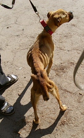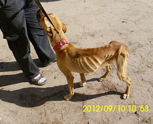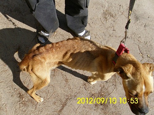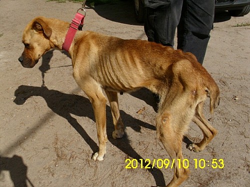 Saba to skrajnie wychudzona i wycieńczona suczka rasy bokser przywieziona 10 września 2012 roku z gminy Ryczywół - miejscowości Ninino.