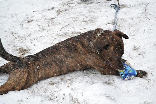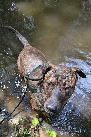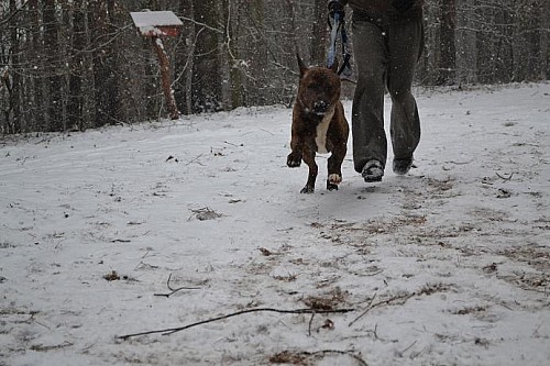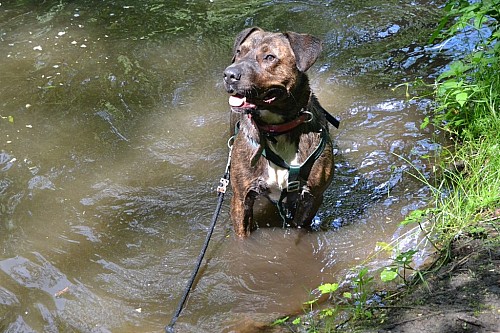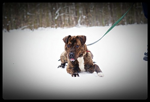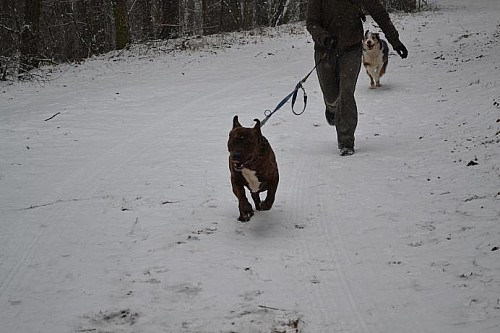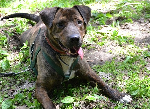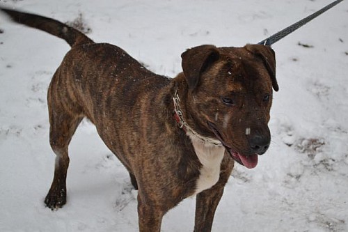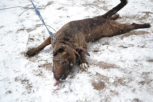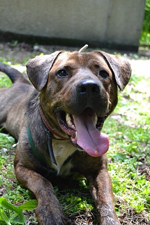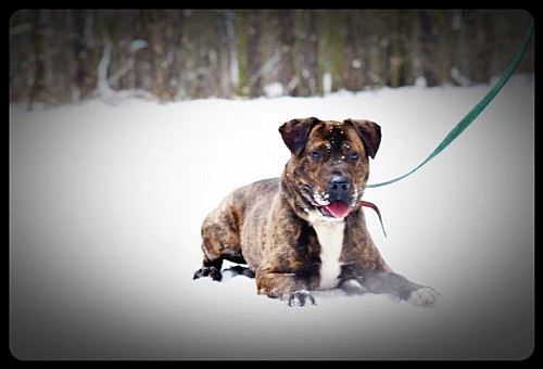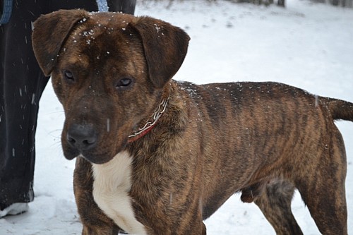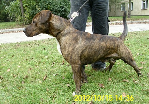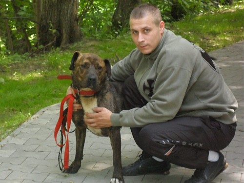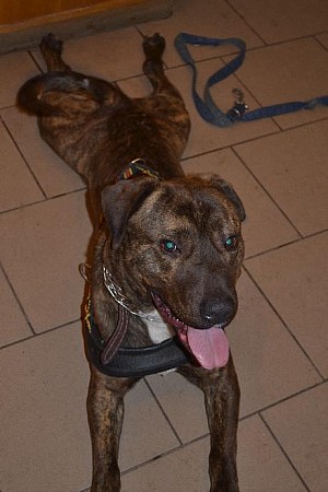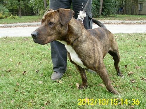 Bob-to około 2 letni Amstaf, po kastracji. Jak każdy amstaf ma wiele energii, uwielbia biegać, bawić się i uczyć. Nie nadaje się na psiaka obronnego, bardziej na domowego pupilka. Z powodu swojej dużej energii nie polecamy go dla rodzin z małymi dziećmi, w wieku szkolnym owszem - jest wspaniałym kompanem do zabaw. Jest łagodny i przyjacielski, ale bardzo dynamiczny i w ferworze zabawy mógłby małe dziecko przewrócić. Jego nowi właściciele powinni być konsekwentni, odpowiedzialni i tak jak i on uwielbiać długie spacery, na których miałby okazję się wyszaleć. Psiak nie ma w sobie agresji, nie stara się konkurować z innymi psami. Raczej szuka z nimi kontaktu by móc się pobawić. Jednak zaatakowany przez innego psa może się bronić, a to bardzo silny, sprawny fizycznie pies, do tego w doskonałej formie, więc konsekwencje mogłyby być przykre. Bob jest bardzo przyjacielski wobec ludzi, umie biegać na lince przy rowerze i jest na etapie nauki biegania przy nodze i rowerze bez smyczy. Wspaniale pływa - uwielbia kąpiele w rzece - mógłby pływać długo i nie rozumie dlaczego po 15 minutach ktoś każe mu wyjść z wody. Jest bardzo karny: na wycieczkach rowerowych pilnuje człowieka, nie ma żadnej chęci na samotną włóczęgę lub ucieczki. Przybiega do opiekuna na jedno gwizdnięcie. To cudowny, radosny pies, który powinien trafić w ręce kogoś, kto potrafi właściwie wykorzystać jego potencjał. Spacer wolnym krokiem, nawet długi na pewno mu nie wystarczy. On musi przynajmniej z 40- 50 minut dziennie otrzymać pokaźną dawkę ruchu:wycieczka rowerowa, bieganie z panem, długi spacer z możliwością swobodnego pobiegania i np. aportowania, ciągnięcie opony, wózka lub sanek, obciążenie go sakwami z np. wodą i prowiantem etc. Nie jest to pies typu huski, który musi przebiegać długie dystanse: raczej 30 minut do godziny, ale bardzo intensywnie. Bob nie przepada za upałami, super byłoby wtedy po 15- 20 minutowym seansie biegania umożliwić mu kąpiel w rzece, lub jeziorze. Raj dla Boba to wycieczka w chłodny dzień tuż po ulewie: wskakuje we wszystkie kałuże, chlapie, chłepce wodę. Kto tego nie widział, ten nie wie jak wygląda szczęśliwy pies. Zabawnie wygląda gdy gna na złamanie karku i jednocześnie stara się merdać ogonem. Jest w nim tyle radości: wystarczy na niego spojrzeć, coś do niego powiedzieć, a ogon mało mu nie odpadnie. Wolontariusz, który uczył go biegania przy rowerze, jest nim zauroczony. Krążą różne legendy o agresywnych Amstafach : jeżeli ktoś pozna Boba, trudno mu będzie w nie uwierzyć. Bob wymaga konsekwencji: ponieważ jest silny nie można mu pozwolić ciągnąć na smyczy. Jest chętny do współpracy z człowiekiem i łatwo się podporządkowuje, trzeba jednak dbać o jego karność i dyscyplinę. Jeżeli ktoś zastanawiał się nad posiadaniem Amstafa, lub jest miłośnikiem tej rasy, nie znajdzie lepszego psa. To "produkt" gotowy: odchowany, zdrowy, karny, o wspaniałym charakterze, śmiały, ufny, przyjacielski, nie grymaszący przy jedzeniu, pozwalający sobie oglądać zęby, cierpliwie znoszący zabiegi pielęgnacyjne - nawet czyszczenie uszu. Można się przekonać jaki jest fajny zabierając go na spacer do pobliskiego lasu. W nowym domu powinien zachowywać się o wiele lepiej niż w schronisku, gdzie pomimo szczerych chęci nie można mu zapewnić wystarczającej porcji ruchu. Czasem bywa tak podekscytowany perspektywą spaceru, że trzeba mu przypomnieć jak ładnie potrafi chodzić na smyczy. Trzymanie takiego psa w schroniskowym kojcu to zwyczajne marnotrawstwo!!!