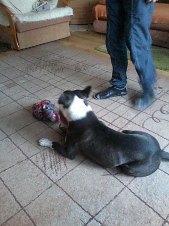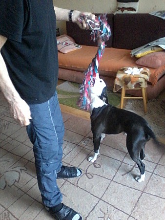 Dzień dobry, przesyłam trochę zdjęć Maksia, ale z domu, jak bawi się swoja ulubioną zabawką-sznurem. Poprzednią wykończył po 3 tygodniach, a i z tej już wiele nie pozostało. Jutro może prześlę coś ze spaceru, choć Maksia trudno złapać w bezruchu-jest żywy jak sreberko.