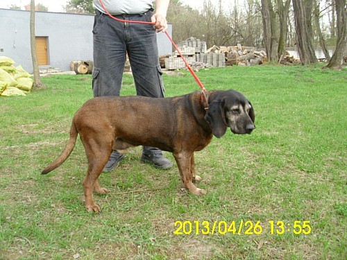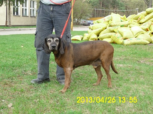 Polo to pies posokowiec, jest starszy. Widać, że jest zadbany, ma brązową obrożę. Został przywieziony w ostatnim tygodniu kwietnia 2013 r. z Wronek - od 2 tygodni siedział z innymi 2 psami na placu GS.