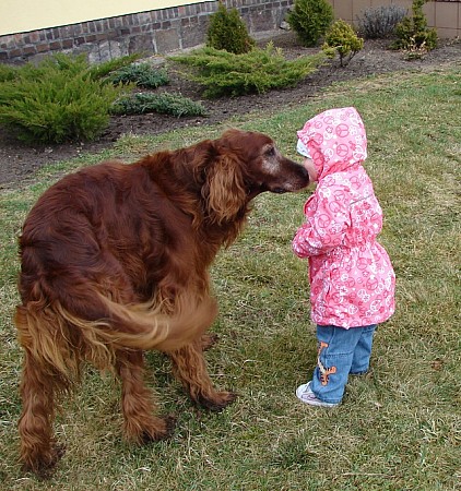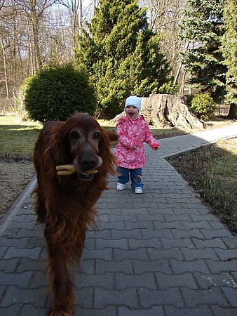 niego i królik kicał koło Argi i nawet przeskakiwał przez niego. W stosunku do innych psów jest uległy, w ogóle nie agresywny, chociaż z racji wieku nie bawi się z nimi długo. Do dzieci jest bardzo łagodny, na spacerze zaczepia do zabawy, z racji tego, że jest duży to jedyną krzywdą jaką może wyrządzić dziecku to przypadkowo w zabawie go przewrócić ale nigdy nie warknąć, a tym bardziej ugryźć. Na chwilę obecną bardziej nadaje się do domu z ogrodem, bardziej woli spać na dworze, w domu jak jest