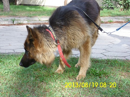 Bond to ok. 2 letni długowłosy owczarek niemiecki. Został znaleziony 18.08.2013 na drodze między Słonawy a Bąblinem. Pies był zdrowy, ładny, wykastrowany, ale dość wychudzony, z zaniedbaną sierścią. Jest łagodny, przyjacielski i opanowany, ale prawdopodobnie był uwiązany na łańcuchu. Nie umie chodzić na smyczy. Przed adopcją zostanie wstępnie ułożony i nauczony posłuszeństwa. Ponieważ jest młody, sprawia wrażenie inteligentnego psa i lubi towarzystwo ludzi - powinien robić szybkie postępy. Dobrze byłoby, gdyby trafił w ręce miłośnika - znawcy rasy. Nie wiadomo jak reaguje na dzieci i koty - po paru godzinach pracy z nim i paru spacerach będzie można powiedzieć o nim znaczenie więcej. Bond okazał się bardzo zrównoważonym psem: nie boi się hałasu i ruchu ulicznego, zachowuje się obojętnie wobec innych psów - nie jest agresywny. Ładnie biega przy rowerze, robi szybkie postępu w chodzeniu na smyczy, spuszczony łatwo daje się przywołać. Bardzo lubi pływać - chętnie kąpie się w Wełnie.