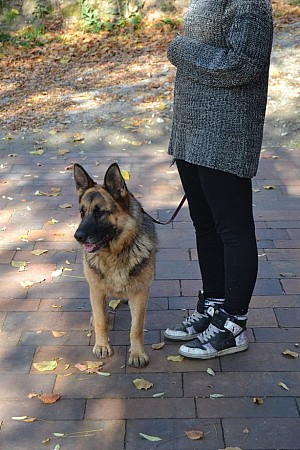 Suczka jest naprawdę kochana. Początkowo była niezbyt zainteresowana człowiekiem i troche spięta. Po niedługim czasie na spacerach sunia zaczęła machać ogonkiem i podchodzić aby ją głaskać :). Lejla podczas jednego spacerku była nad rzeczką, nie miała wchodziła do wody, bo pogoda już jesienna, ale ona prawie wskoczyła sama do wody po czym zaczęła biegać w kółko i cieszyć się :) Jak widać na jednym zdjęciu Lejla nie jest wielkości wzorcowego owczarka tylko troszke mniejsza. Ładnie chodzi na smyczy, nie szarpie się, ale woli iść 2 metry przed człowiekiem niż koło nogi. Ignoruje inne psy, zdażyło jej się chwile pobawić z jednym psiakiem, ale widać, że jej się nie chciało.