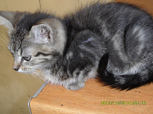 Marmurek to kocurek w wieku około 2-miesięcy.Ma ciekawe umaszczenie w szerokie czarne pręgi.Umie korzystać z kuwety.