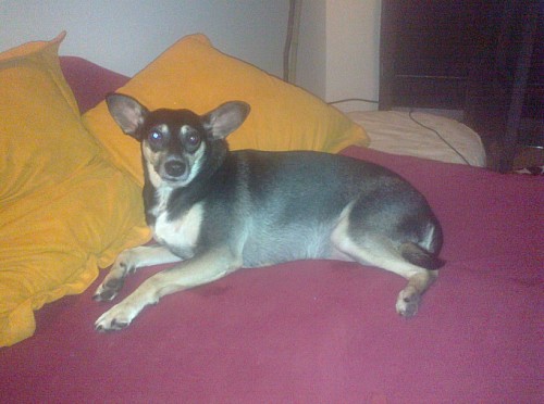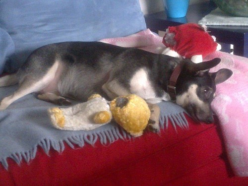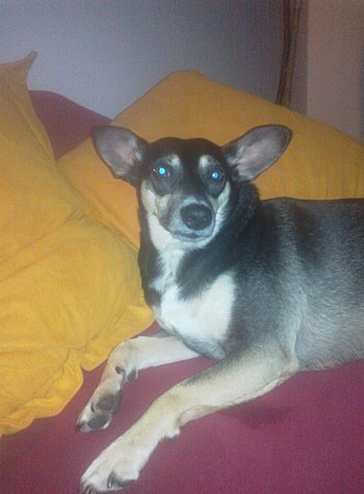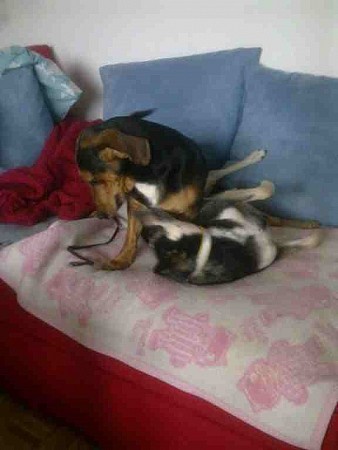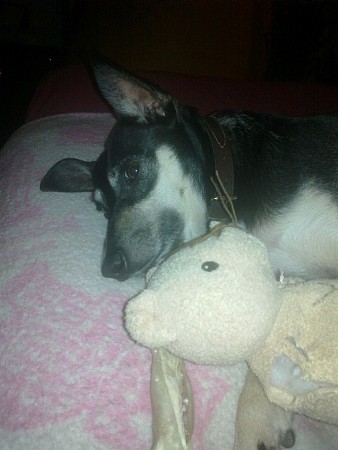 Teraz już sama przychodzi po pieszczoty i już nie pomrukuje jak widzi rękę. W nocy zakopuje się i chowa. Znów serce się kraje, musiała się pewnie chować jak Pan sobie wypił. Dosypia spokojnie do rana bez piszczenia i brudzenia. Niestety nie umie jeść suchego, dostawała tylko ludzkie żarcie - nawet na puszki nie reaguje, trzeba będzie ją przestawić z mięsa i parówek na zdrowe jedzenie - no chyba, że komuś nie przeszkadza gotowanie mięska i ryżu dla pieska.