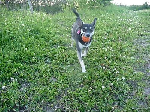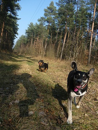 Na spacerach jest posłuszna, nie ciągnie, na bezpiecznym terenie można ją spuścić ze smyczy, nie ucieka, za to biega jak szalona mimo brzuszka. Widać, że nadal jest w niej radość i ufność do człowieka mimo, że na
