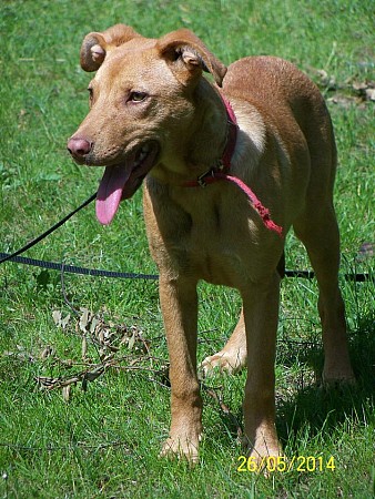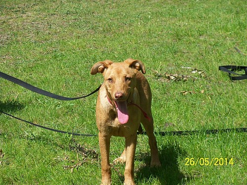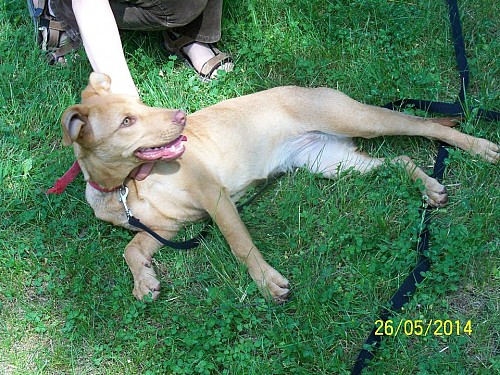 Kalina to młoda suczka, pogodna, wesoła, przyjacielska, nie ma żadnych złych naleciałości, nie próbuje dominować, posłuszna. Została przywieziona ze Złotnik pod koniec maja 2014 r., jedną stronę boku trochę brudną od smoły.