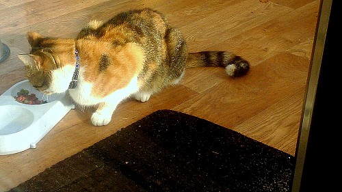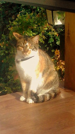 Szukam właściciela. Przybłąkała się do Bogdanowa i od tygodnia nie opuszcza tarasu. Kotka jest bardzo łagodna. Ma fioletową obrożę. Może ktoś jej szuka.