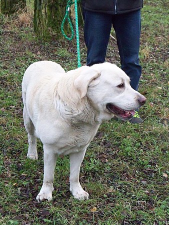 pies, około 5 letni labrador biszkoptowy, duży, nie kastrowany, bez czipa i tatuażu. Błąkał się po 11- w Obornikach- musiał przez jakiś czas przebywać przy świniach bo miał zapach odchodów świńskich.