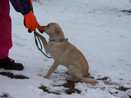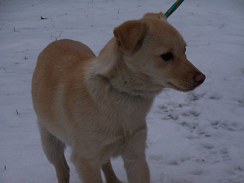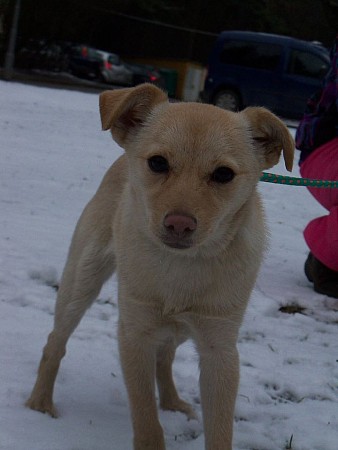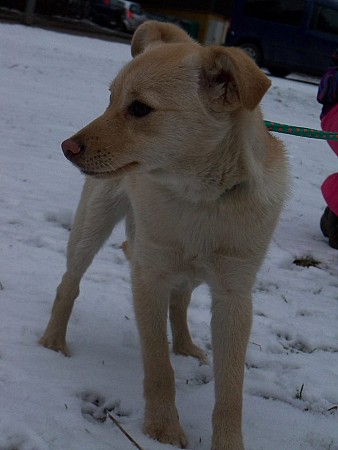 Kropka to młodziutka ok. 6-8 miesięczna suczka. Przywieziona 27 stycznia 2015 r. z Rogoźna spod sklepu Biedronka. Sunia jest wesoła, łagodna. Jest bardzo malutka i drobna.