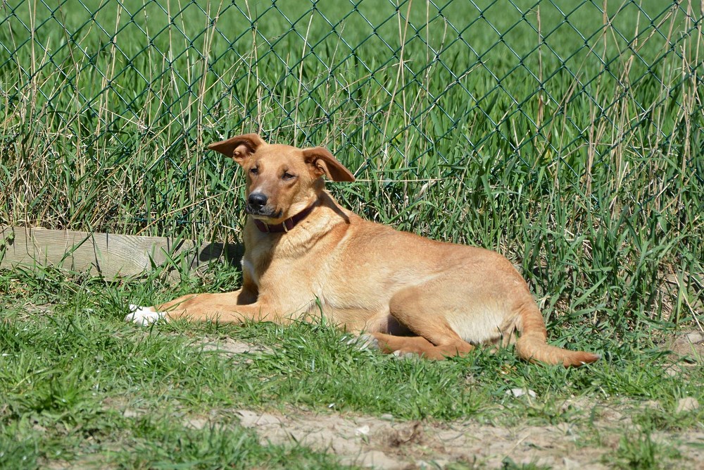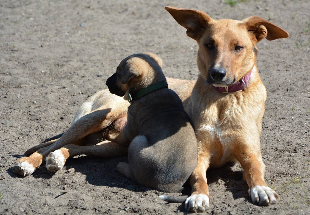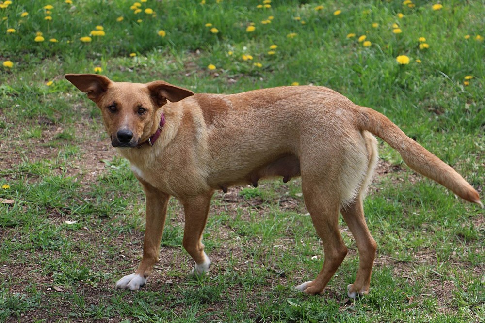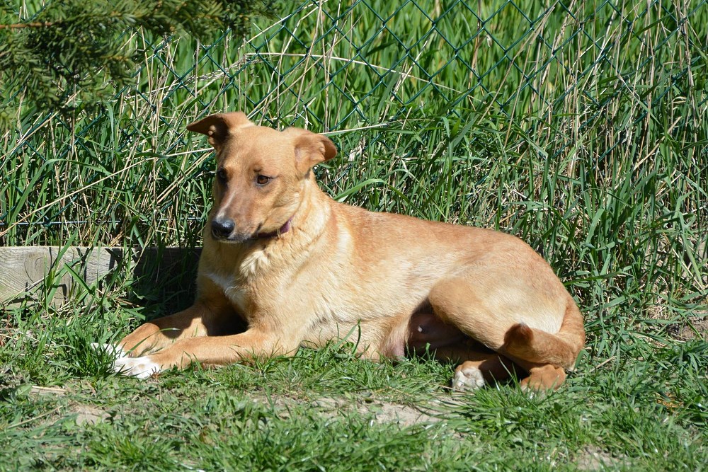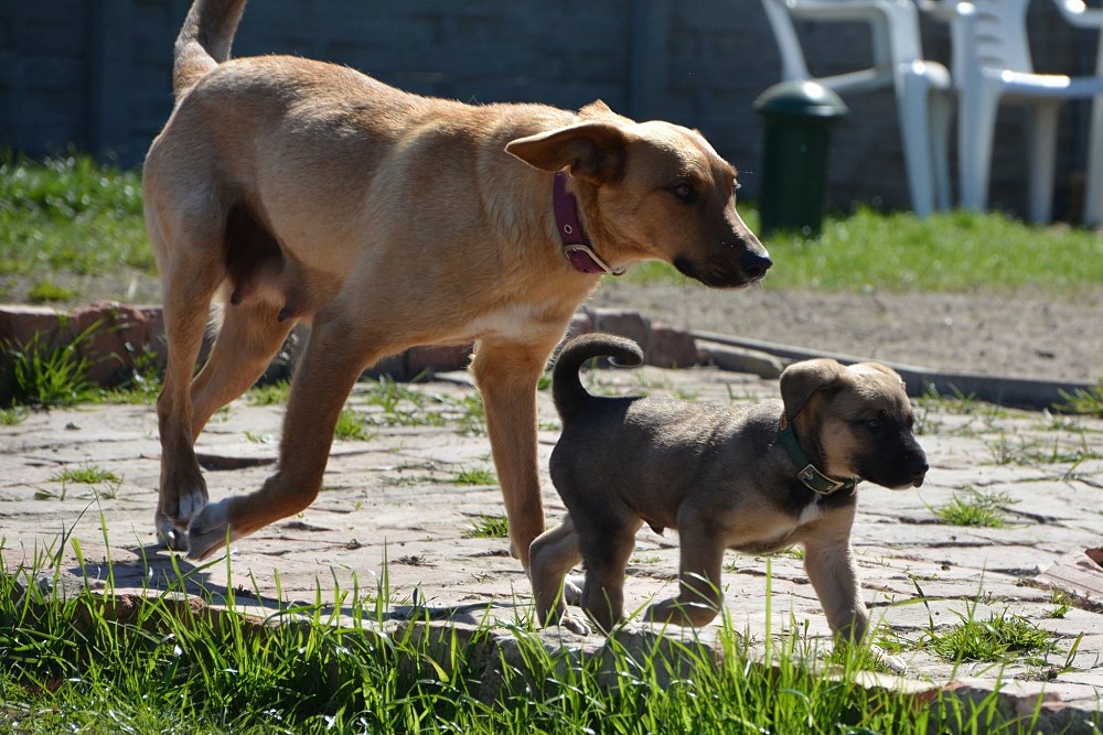 Młoda suczka przywieziona została 13.03 z ślepym miotem z gminy Rogoźno. Suczka przestraszona sytuacją- oszczeniła się gdzieś w stodole. Nie jest agresywna, chodzić na smyczy póki co nie potrafi.