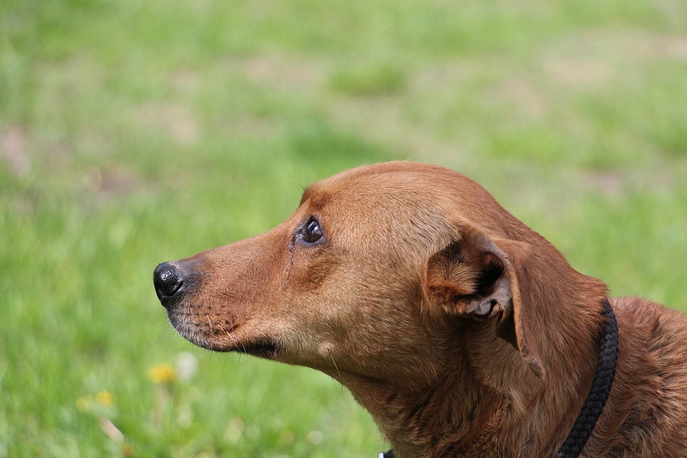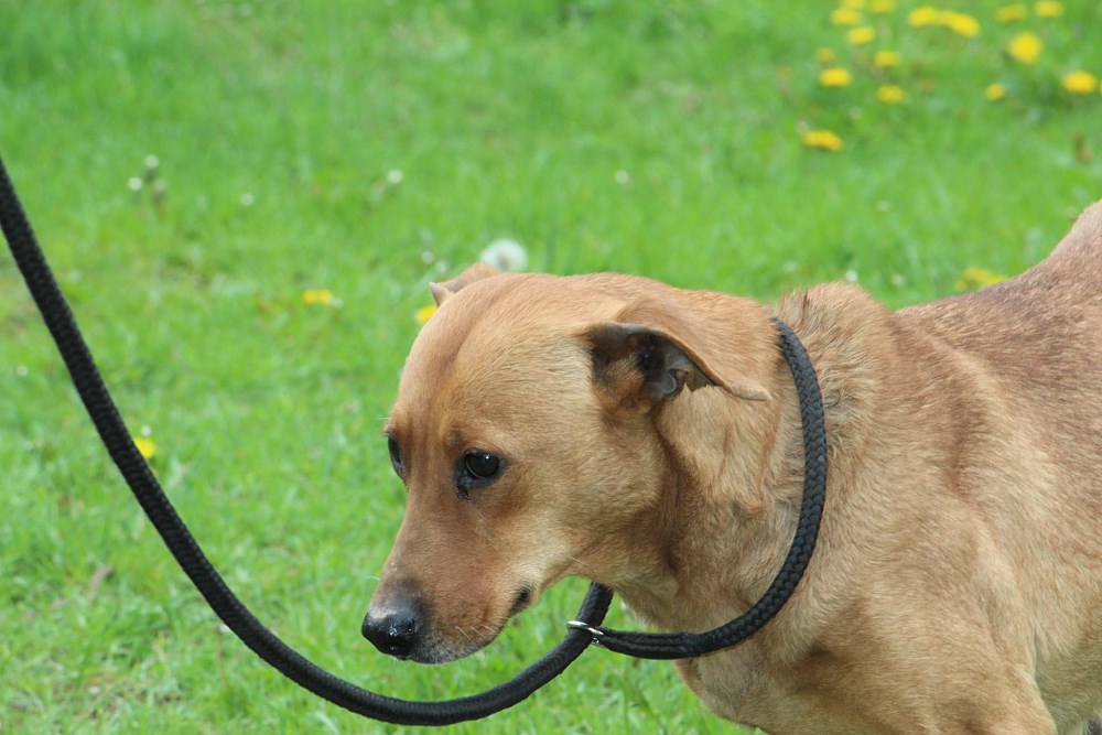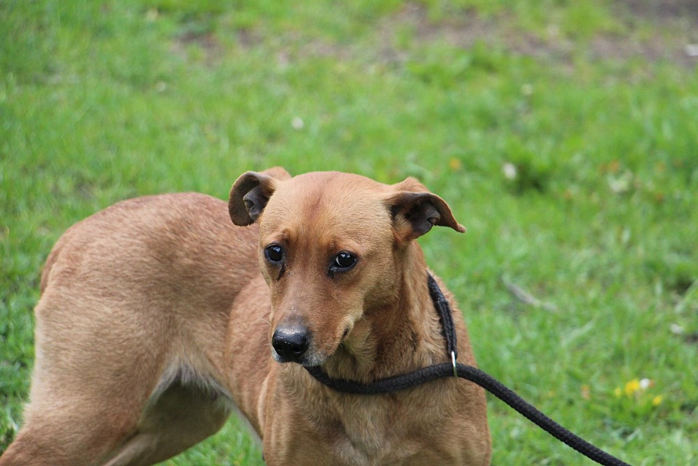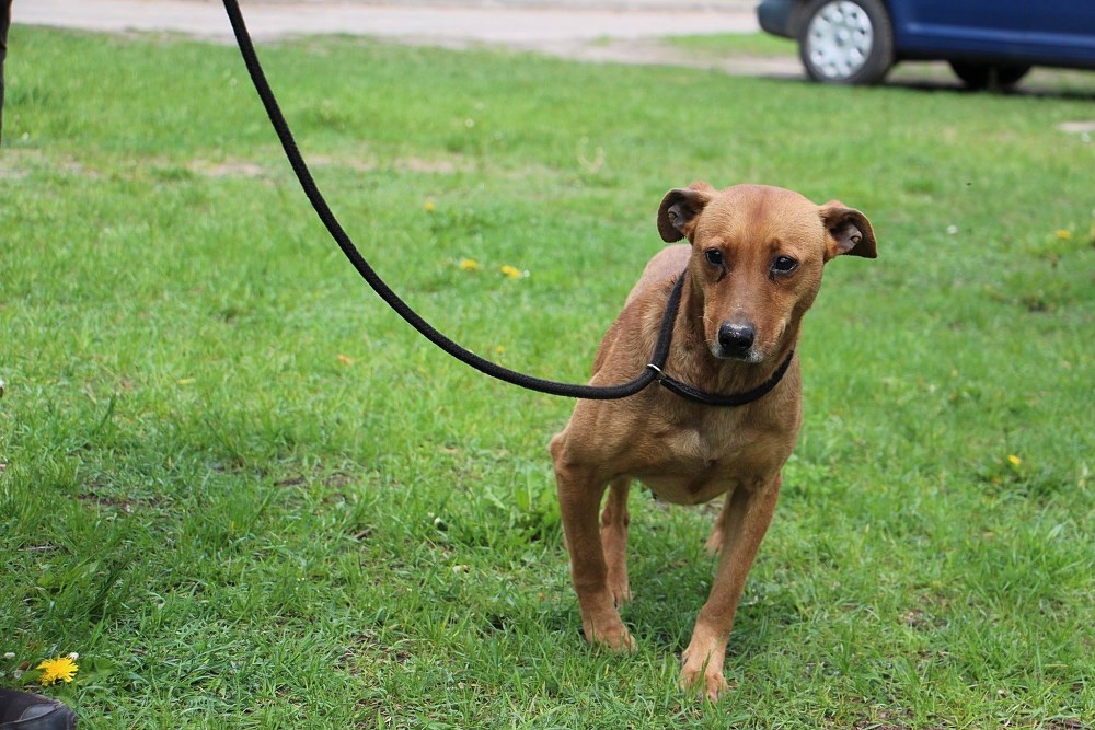 Suczka około 3 letnia przywieziona 13 maja z gminy Murowana Goślina- ma ślad od uwięzi na szyi, musiała mieć niedawno miot, który odkarmiła. Boi się ręki podnieszionej i gwałtownych ruchów, ale jest łagodna