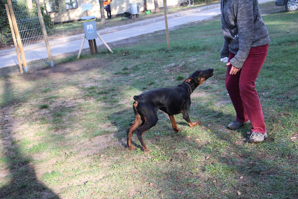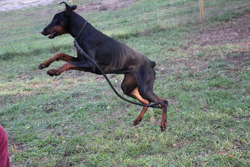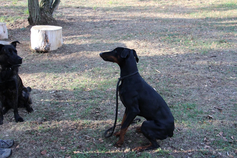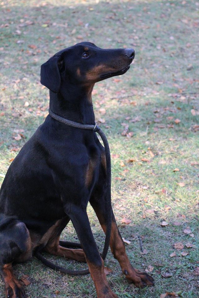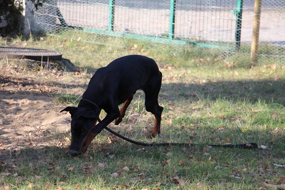 Suczka dobermana, młoda z kopiowanym ogonem złapana na 11-stce w Ocieszynie ( gmina Oborniki). Suczka bez tatuażu i czipa. Wesoła, łagodna, pełna energii.