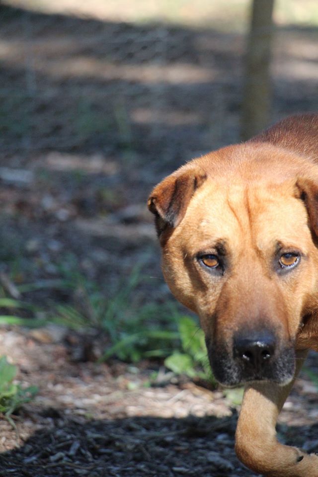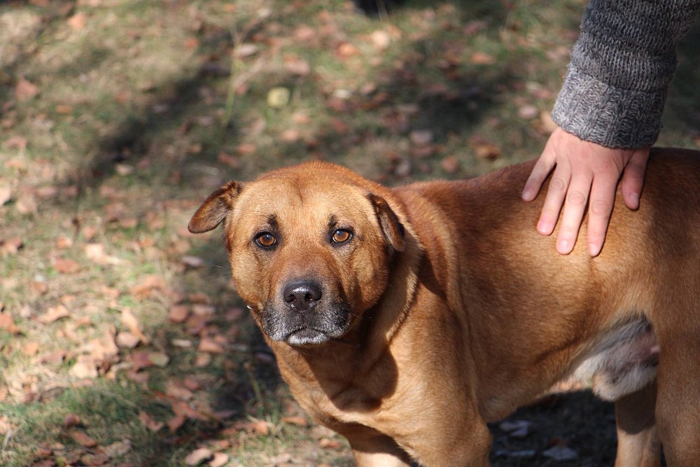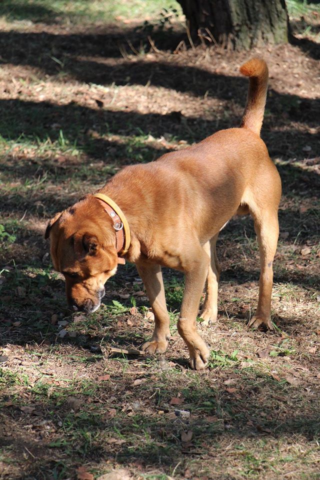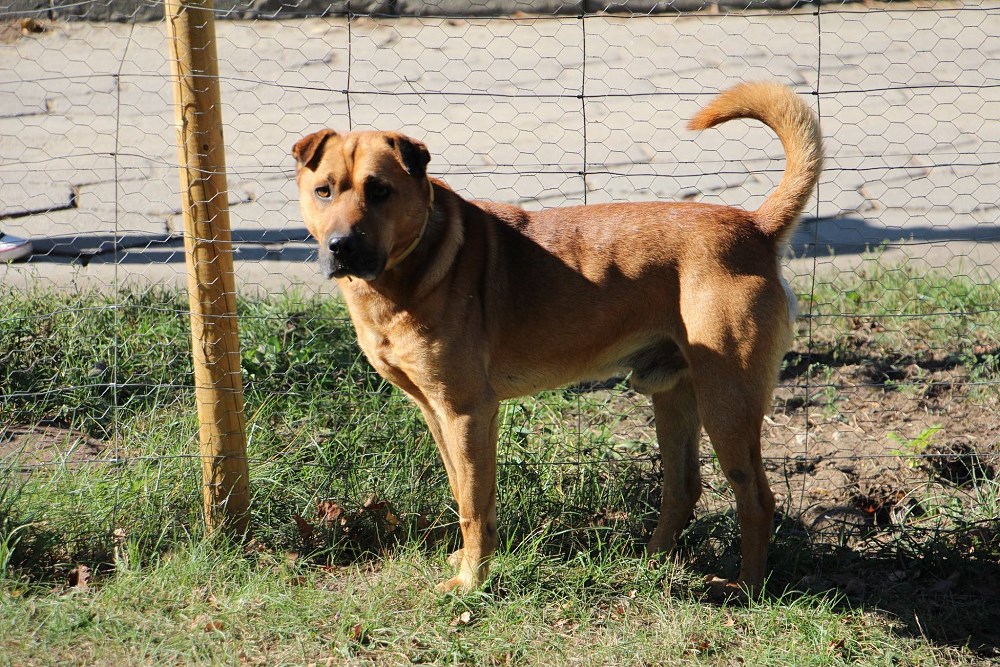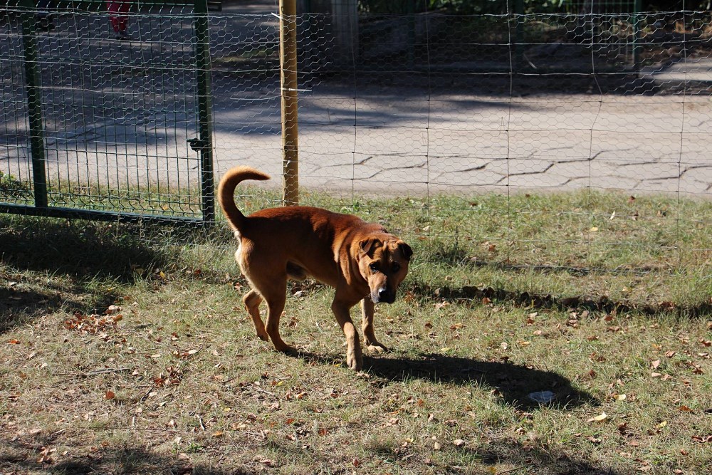 Pies z gminy Oborniki, ma około 3 lat, w typie shar pei. Łagodny, spokojny, stara się utrzymać czystość w kojcu.