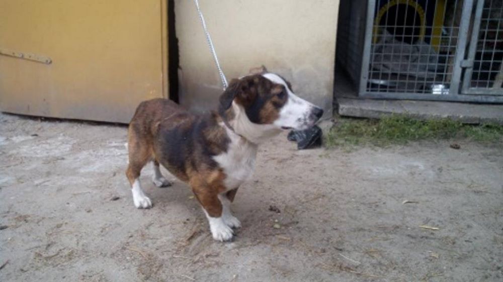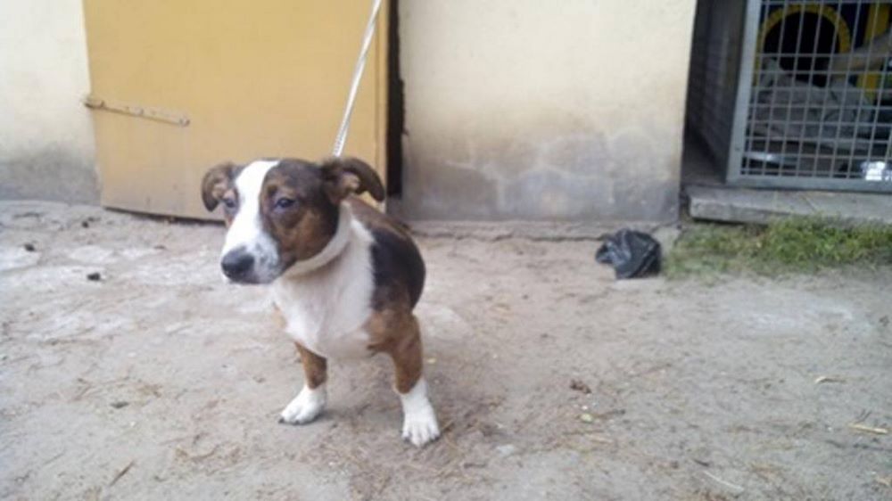 Bulti - młody pies przywiązany do drzewa w obornickim lesie. Do schroniska trafił 9 lipca.