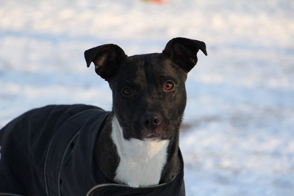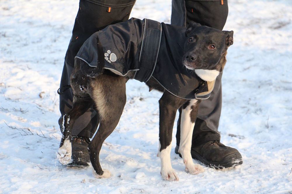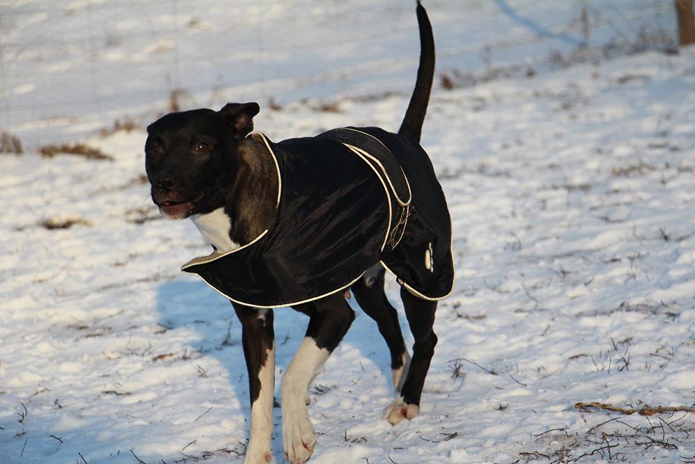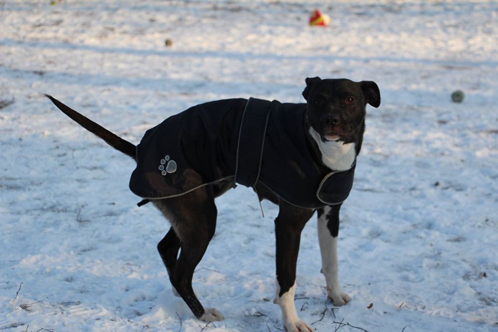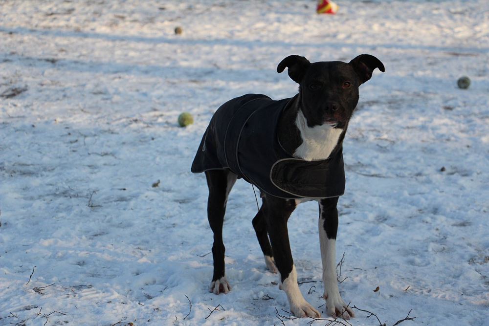 Suczka z gminy Czarnków, przywieziona 9 stycznia z miejscowości Kuźnica Czarnkowska po której biegała od miesiąca, miała młode. Ma ok 1,5 roku. Bardzo marznie.