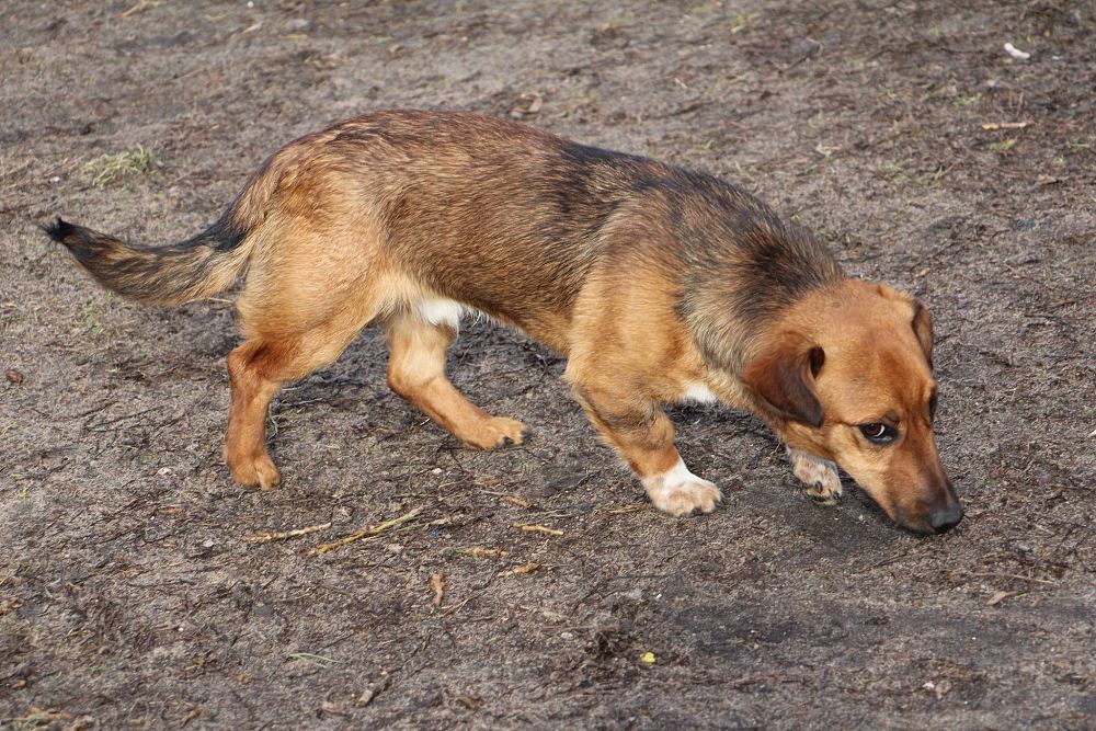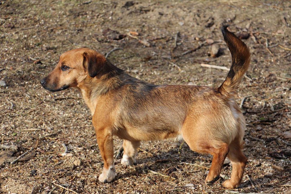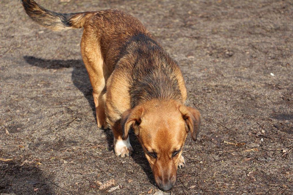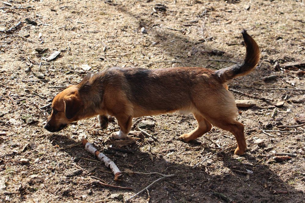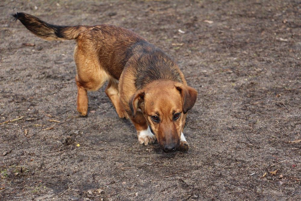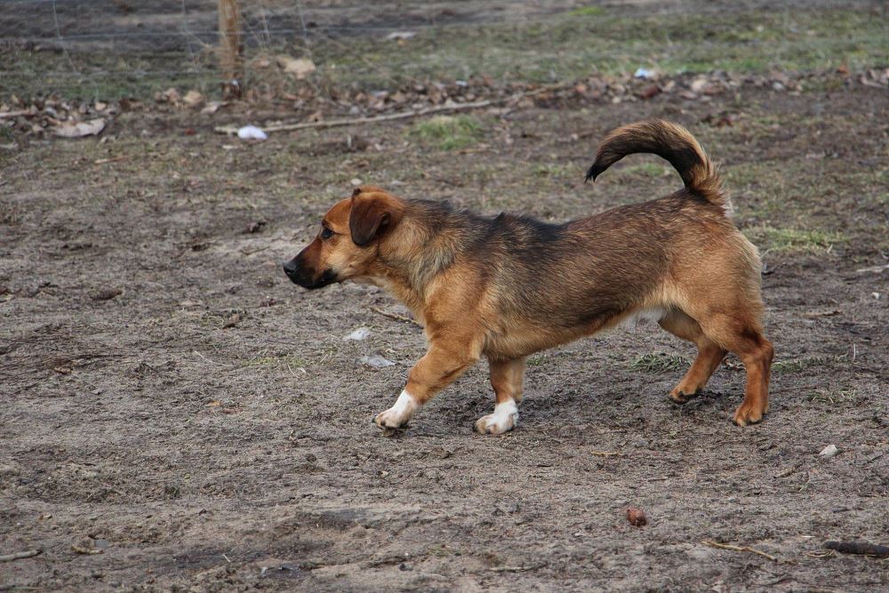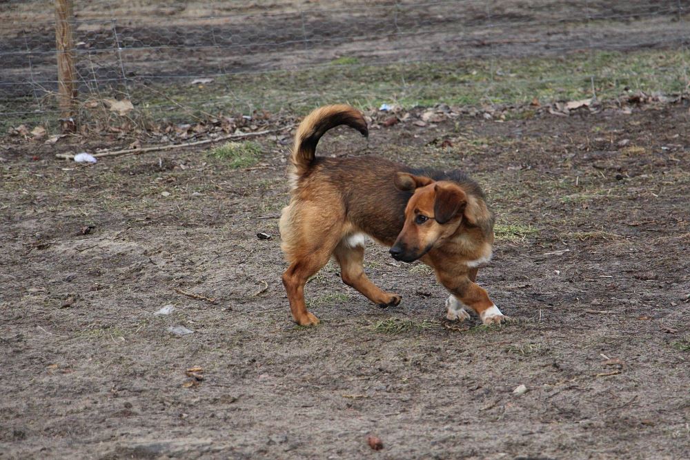 Pies około 1,5 roczny przywieziony 20 lutego ze Sarbi w gminie Czarnków. Od jakiegoś czasu biegał po wsi. Bardzo ładnie chodzi na smyczy, trochę się boi ludzi, ale chętnie dawał się głaskać.