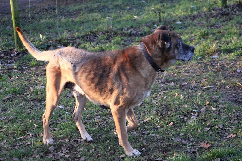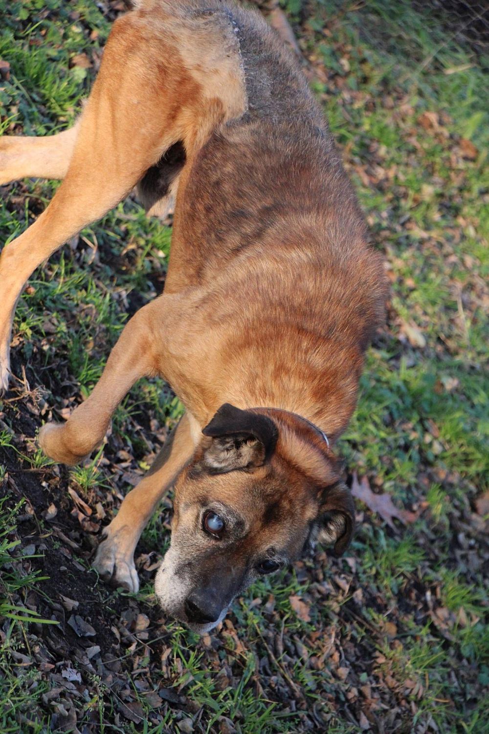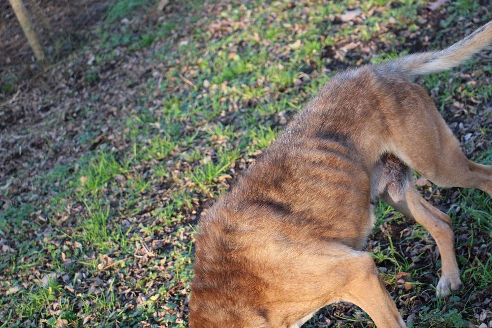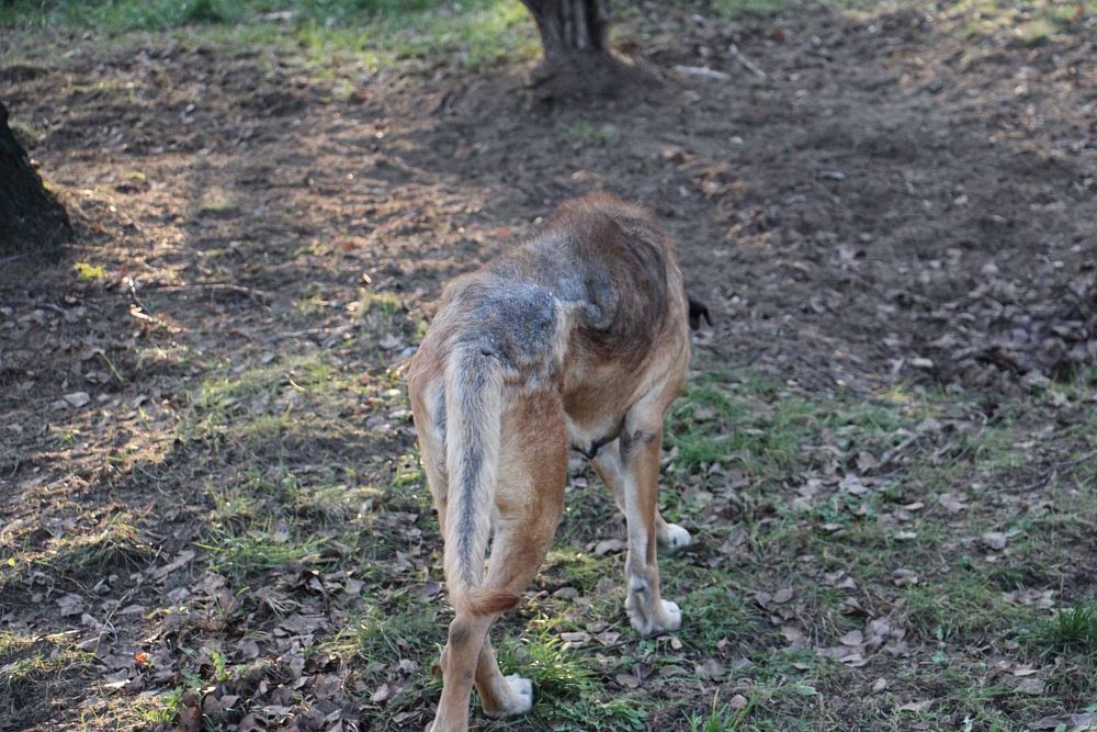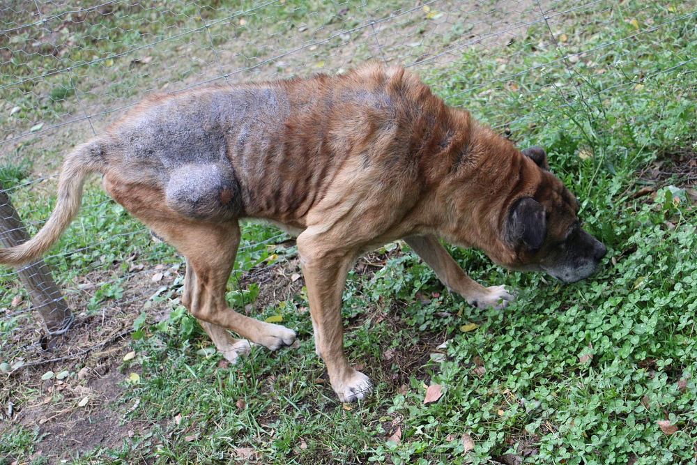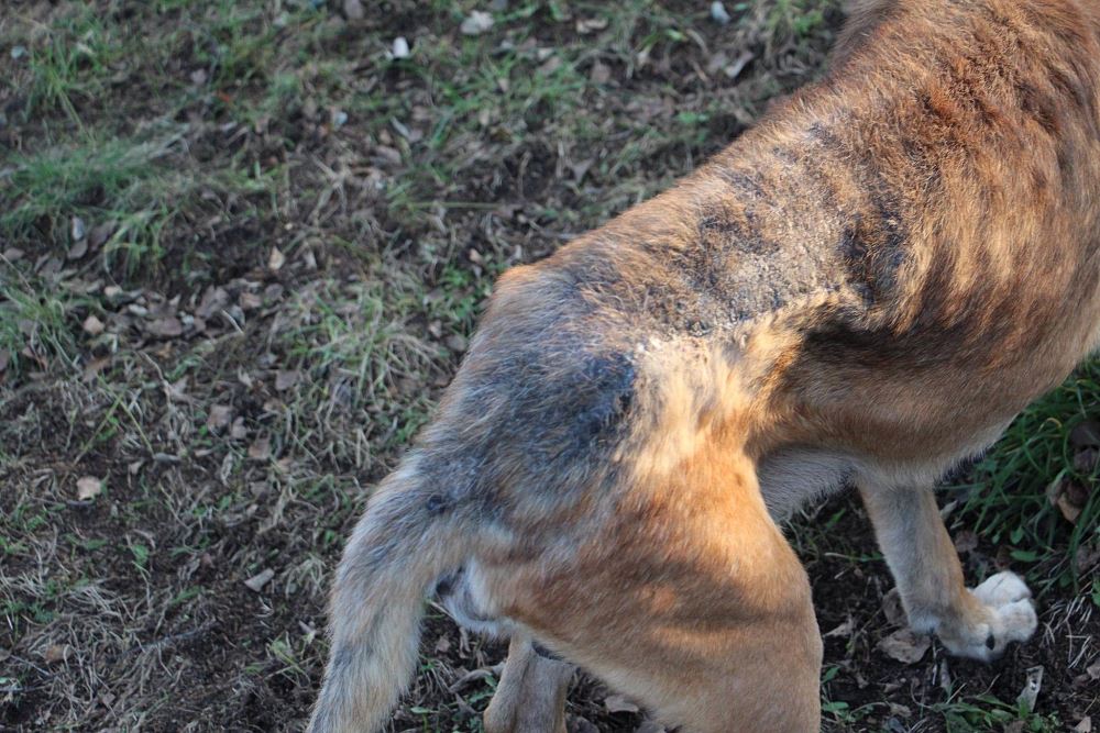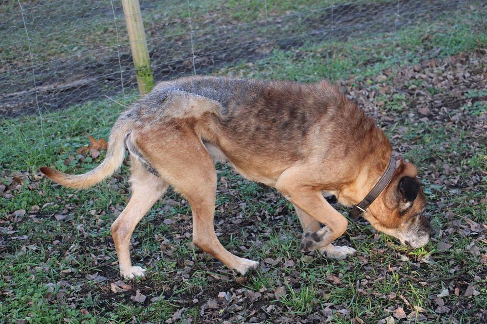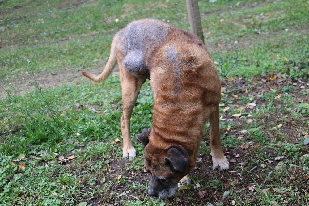 Pies odebrany interwencyjnie z Gminy Oborniki, mieszkał w betonowym, rozsypującym się budynku na stercie puszek i butelek i na tynku, który spadał z sufitu. Jest tak zachwycony suchą budą z miękkim kocykiem, że trzeba go prosić aby poszedł na spacer. Zrobiona diagnostyka, czekamy na wyniki a teraz zajmujemy się skórą.