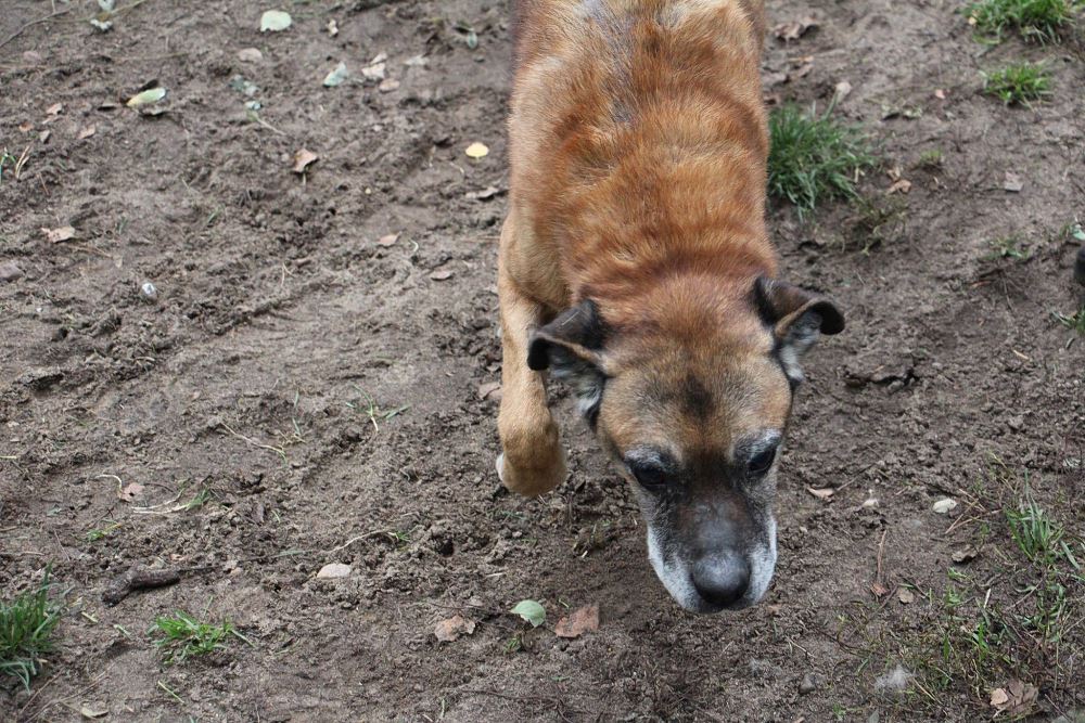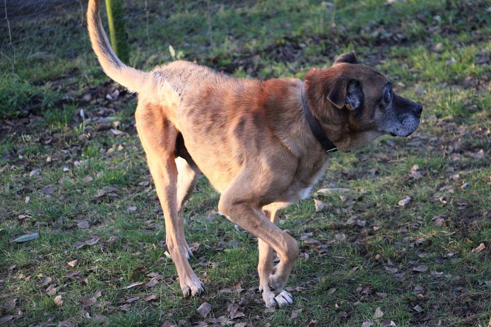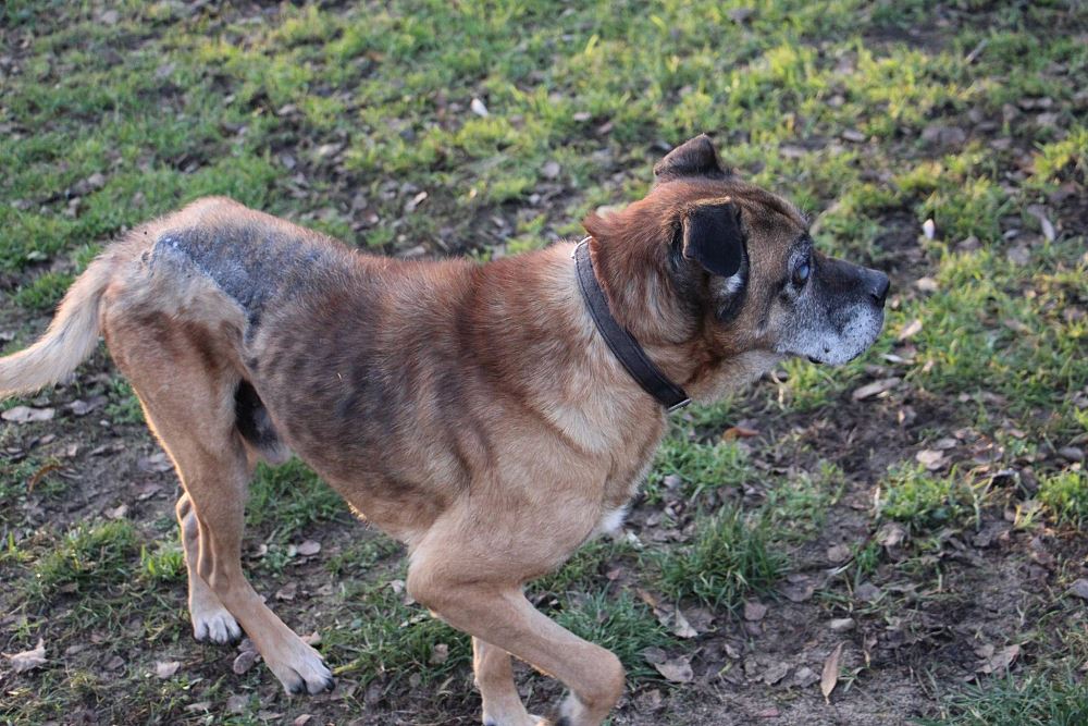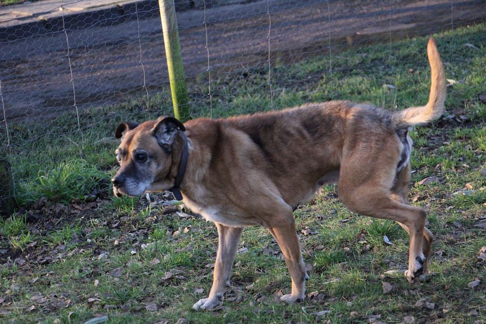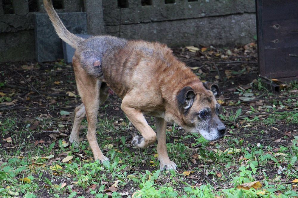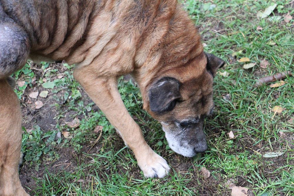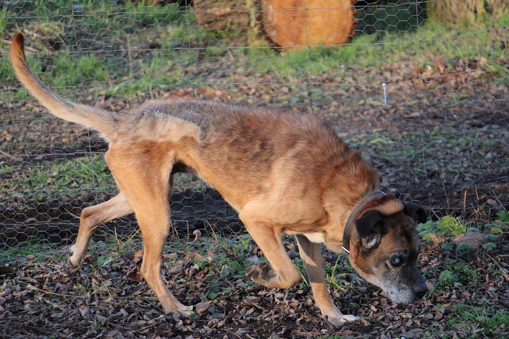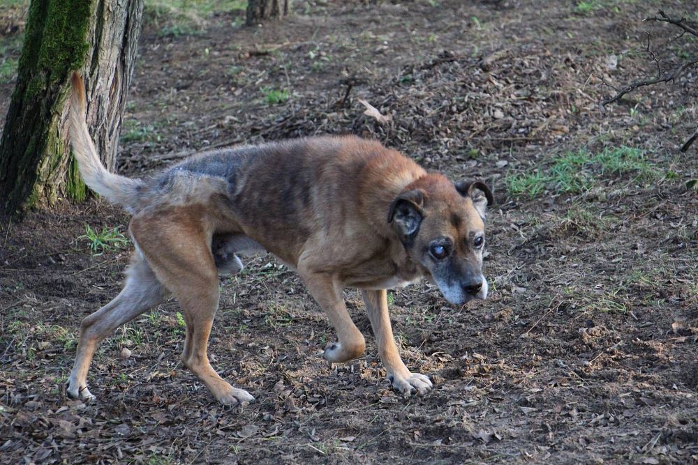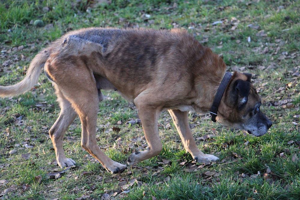 Pies odebrany interwencyjnie z Gminy Oborniki, mieszkał w betonowym, rozsypującym się budynku na stercie puszek i butelek i na tynku, który spadał z sufitu. Jest tak zachwycony suchą budą z miękkim kocykiem, że trzeba go prosić aby poszedł na spacer. Zrobiona diagnostyka, czekamy na wyniki a teraz zajmujemy się skórą.