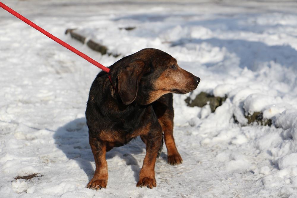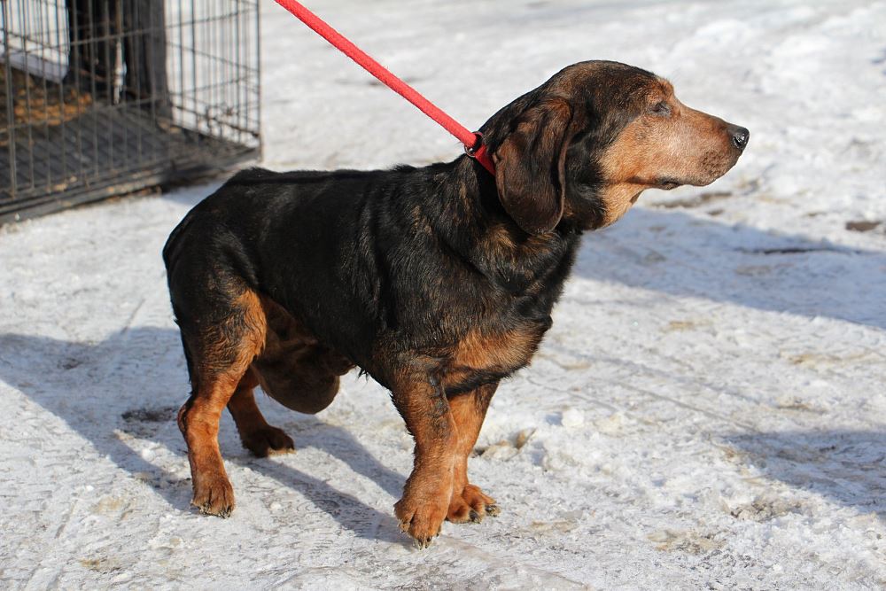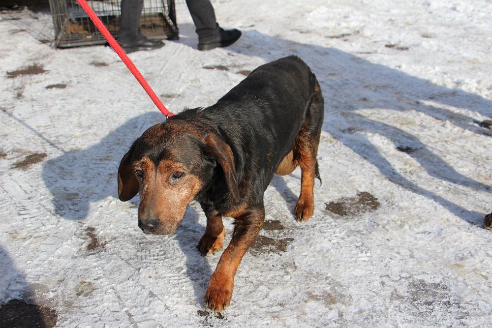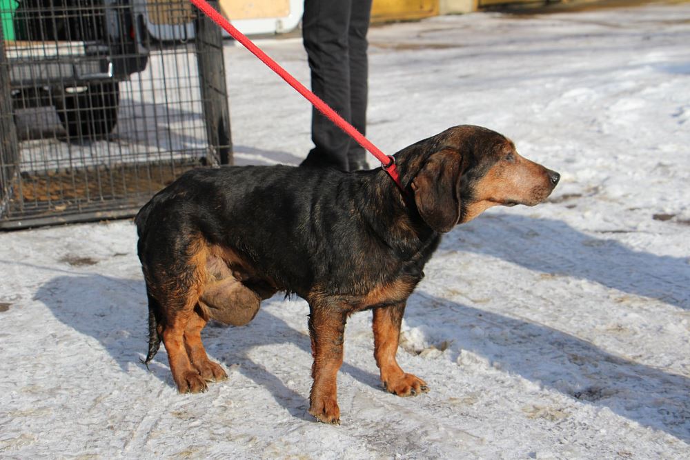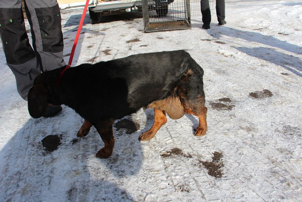Suczka, przyjechała do nas 5 lutego z gminy Kamieniec, jej właściciel zmarł. Przyjechała z Bosiem. Jest spokojna ale ma duże guzy na listwie mlecznej.