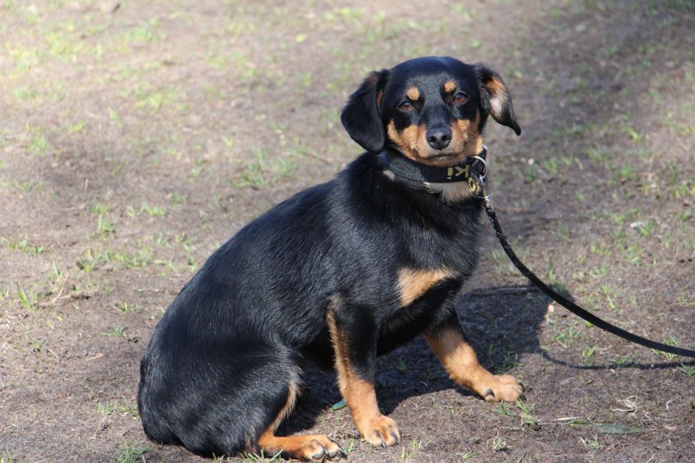 Suczka - siostra Flory odłowiona w Gościejewku w gminie Ryczywół 28 marca. Jest bardzo nieśmiała, boi się ludzi i im nie ufa ale jest zadbana i dobrze odżywiona. Ma około roku, powoli ją uczymy kontaktu z człowiekiem i smyczy...