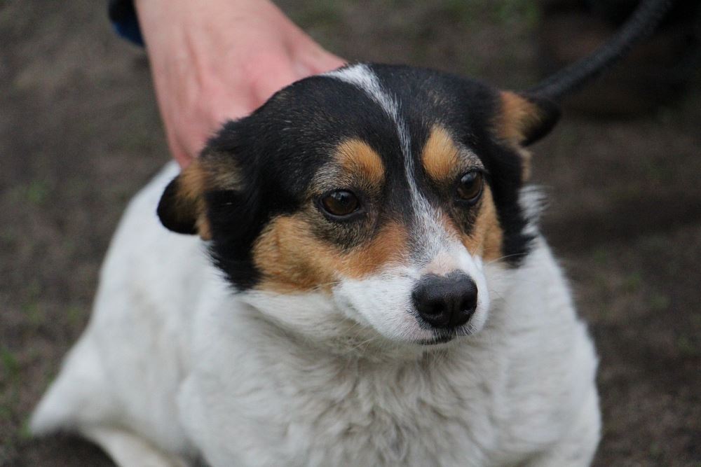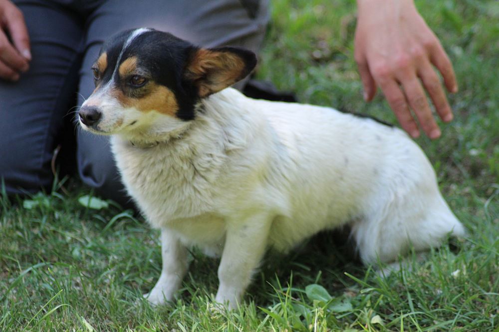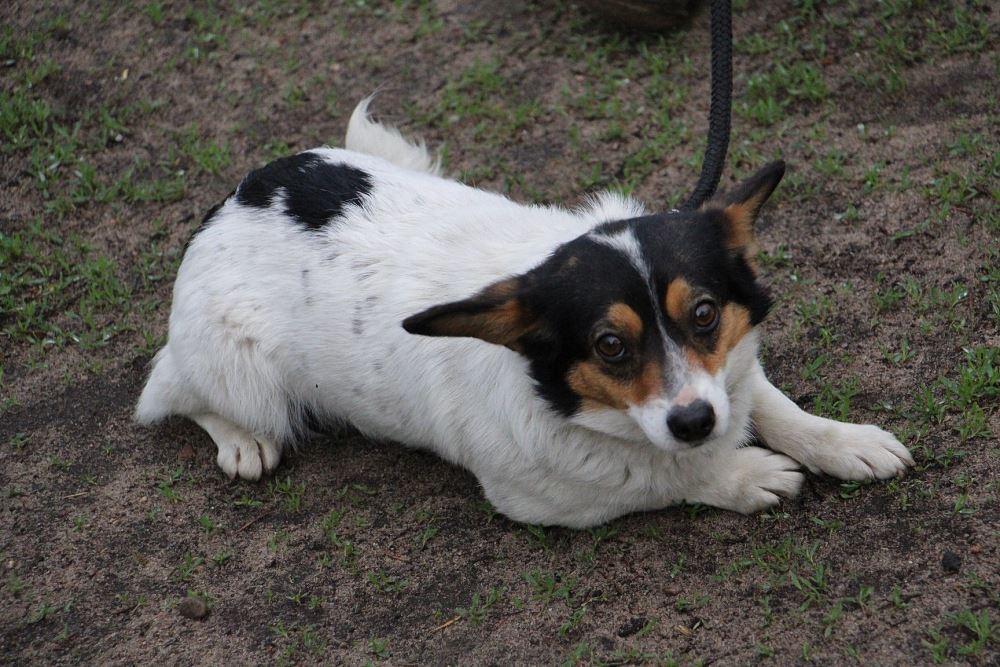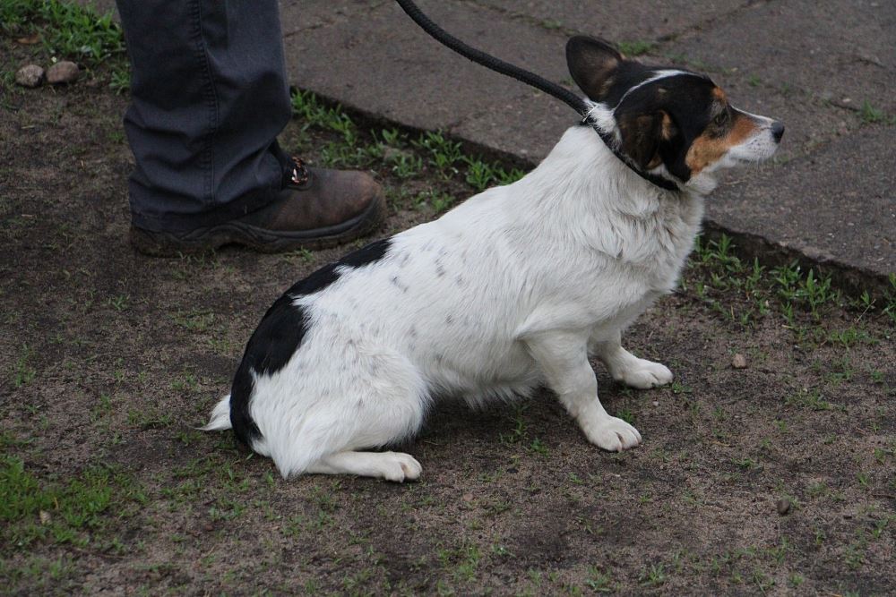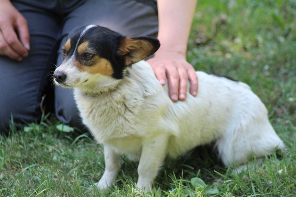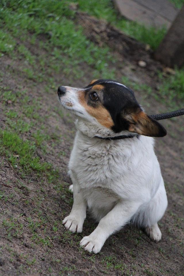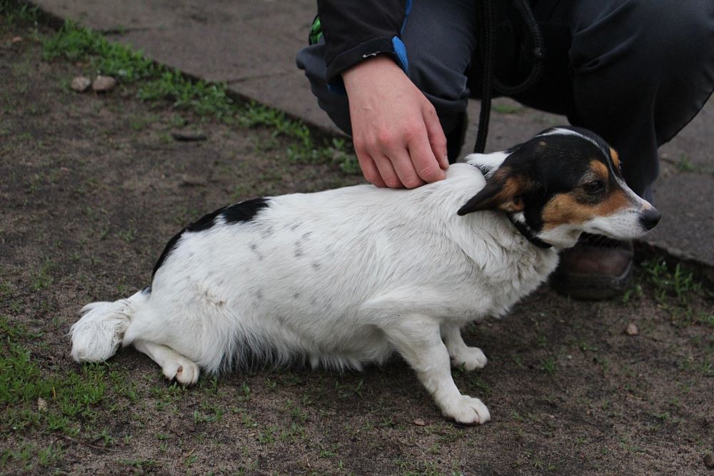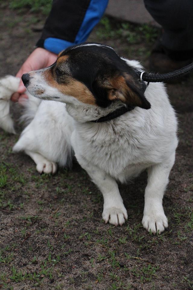 Suczka odłowiona 22 kwietnia na ul. Tartacznej w Obornikach- około dobrego tygodnia tam przebywała. Jest młoda- ok.1,5 roku. Garnie się na kolana do głaskania, choć nowym osobom nie ufa. Uczy się chodzić na smyczy.