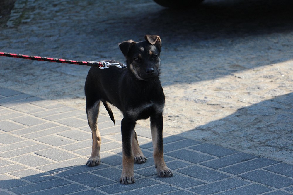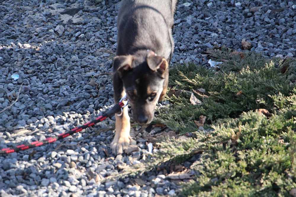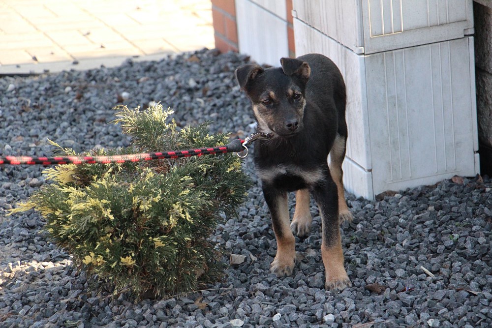 Pies, szczeniak około 3,5-4 miesięczny przywieziony do schroniska 26 lutego z lasu w Wypalankach w gminie Oborniki. Porzucony z rodzeństwem( brat lub siostra) w lesie które po ciemku uciekło. Jest uczony zaufania do ludzi w DT w Obornikach.