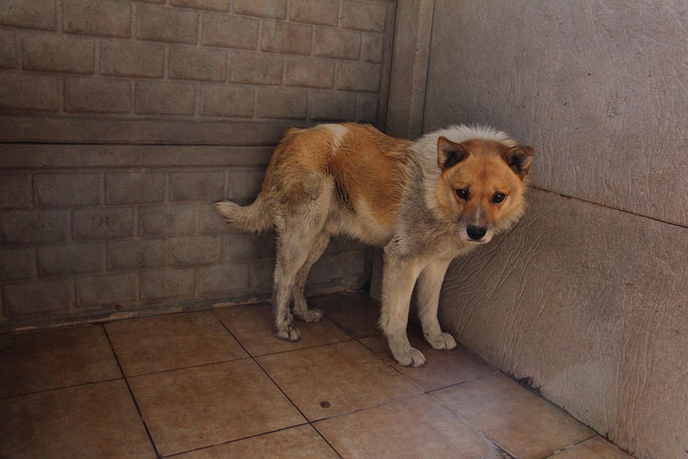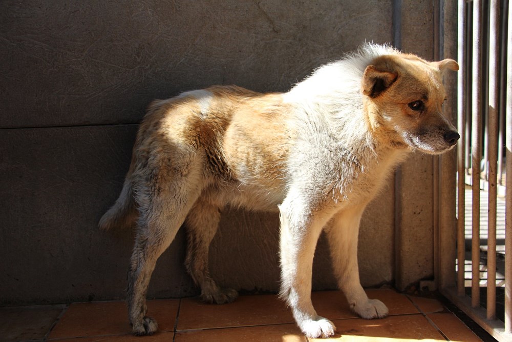 Peter, pies przywieziony z Grodziska Wielkopolskiego w środę 17 kwietnia 2019 r. Peter bardzo długo błąkał się po ulicach Grodziska, udało się złapał go w klatkę łapkę. Nie wykazuje zachowań agresywnych, ale nie ufa ludziom, nie zna smyczy. Rozpoczynamy pracę nad oswajaniem chłopaka. Na razie został odpchlony i odrobaczony.